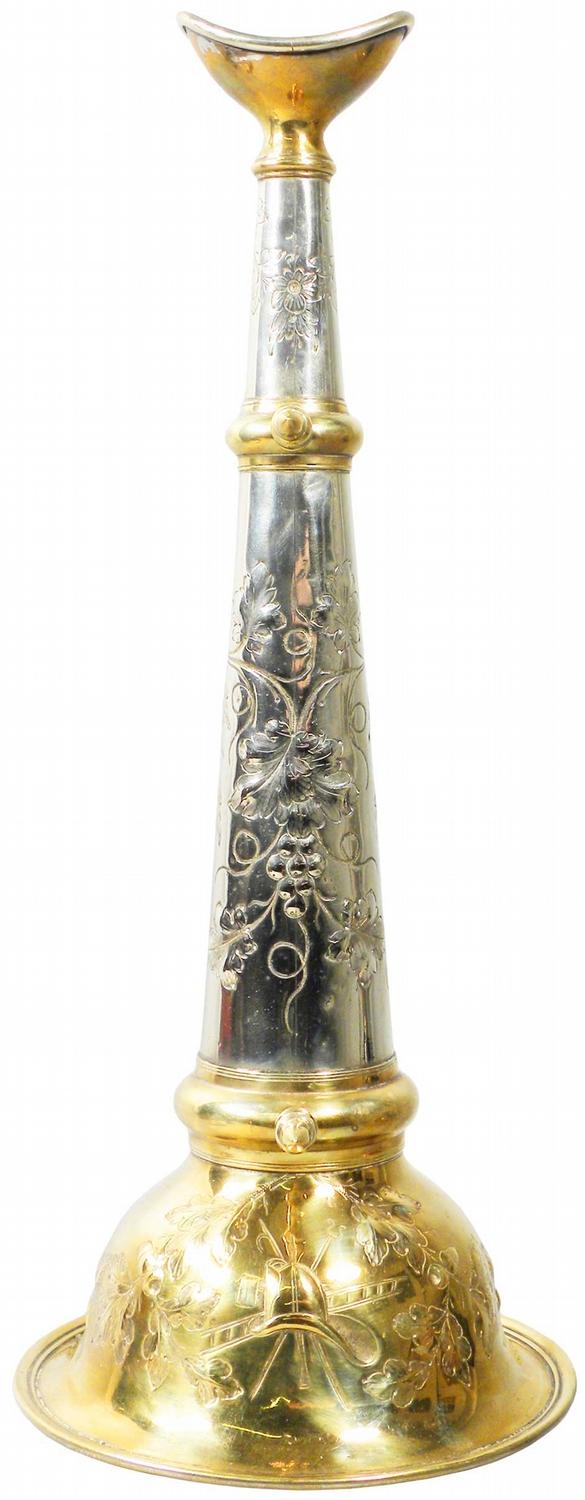 Presentation Fire Trumpet. Gold and silver plated. Inscribed in German "Geschenk der, Union Haken & Leiter Comp No. 1. Jhrem Preside ten, Teriie Haute, 1861" Excellent condition. 17 1/2 inches tall and 7 1/2 inch diameter bell.