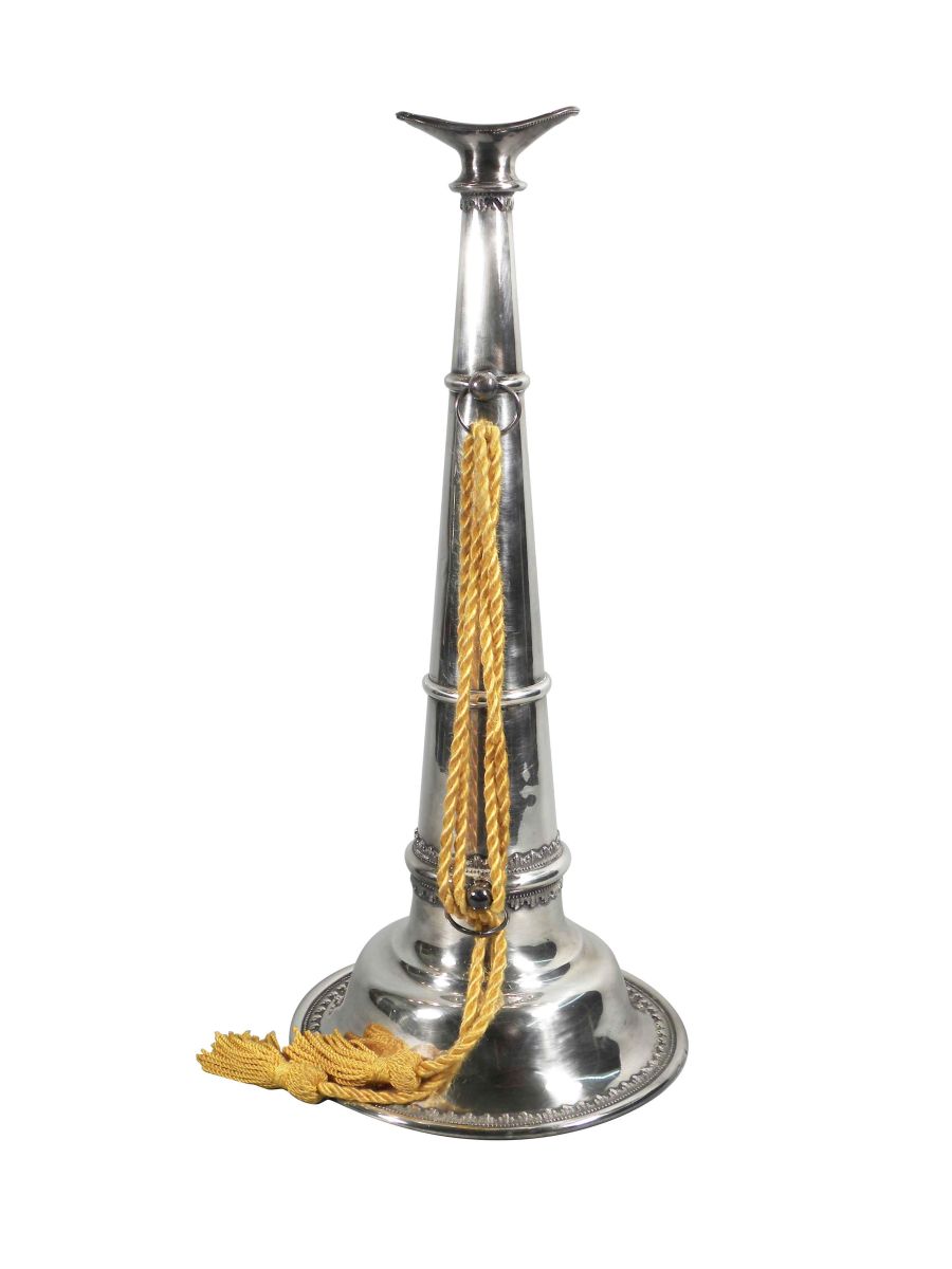 Presentation Fire Trumpet, silver plated brass. Voted to Excelsior Hook and Ladder Company at G.A.R. Manchester, N.H. October 10, 1873. Complete with original tassel, excellent condition. 8 3/4 inch bell, 19 inches tall.