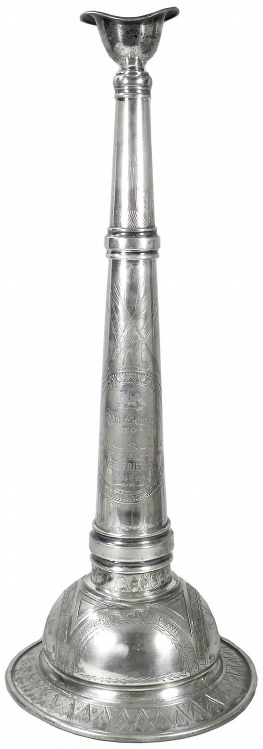 Presentation Fire Trumpet, silver plated. Presented to Lincoln H & L Co. by their Dover Friends, Nov 14, 1879. Beautiful etched detail with eagle ring holders. Excellent condition. 21 inches tall with 8 1/4 inch diameter bell.