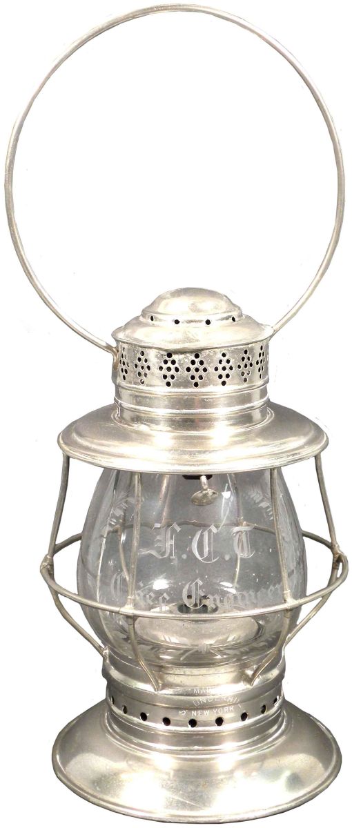 Presentation Lantern, nickel plated with etched glass globe. F.C.T. Chief Engineer. Very good original condition. 10 inches tall.