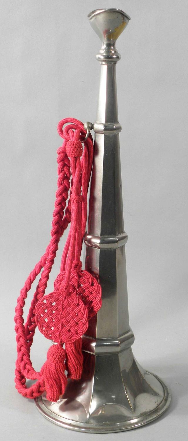 Presentation Firemen's Trumpet. Presented to Chief P.F. McCartney by Washington Hose Co. No. "1" R.F.D. Cairns & Bros, New York makers. Nickel plated brass. Very slight nickel loss otherwise excellent condition. Fluted bell measures 7 inches X 19 inches tall.