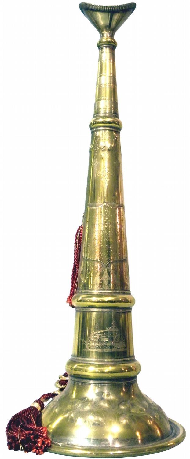 Presentation Firemen's Trumpet. Presented to Thomas F. Redman, Foreman by the Members of Excelsior Engine No. 2. March 30th 1870. Brass plated with etched and embossed detail. Décor includes fire pumper, helmet, trumpets and floral motif. Some minor wear to brass around rim of bell otherwise excellent condition. Bell measures 7 3/4 inches diameter X 21 1/4 inches tall.