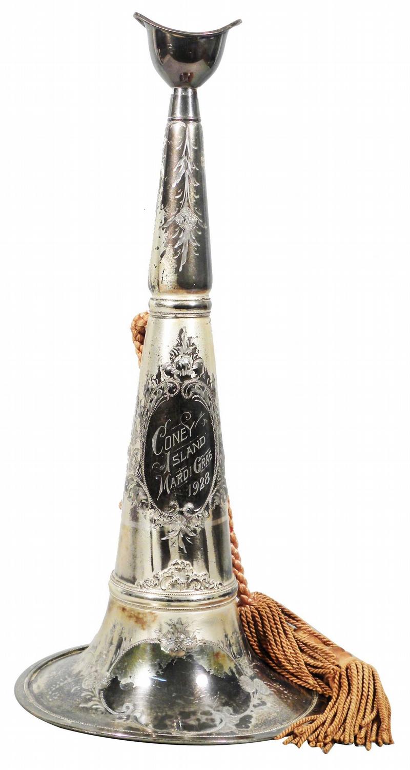Presentation Firemen's Trumpet. "Coney Island Mardi Gras 1928" Etched and silver plated. Original braid and tassels. Some silver worn otherwise very good condition. 18 1/2 inches tall , 8 3/4 inch diameter bell.