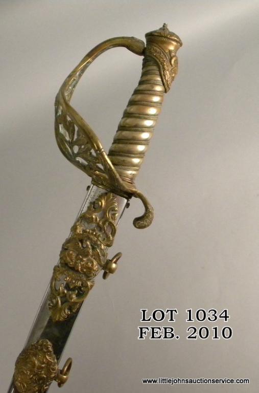 Presentation Grade Civil War Cavalry officer's sword with guard. Period inscribed "Presented to Capt. Daniel Lillie by the veteran volunteers of Co. I, 4th VT., Feb 3, 1964" in beautiful script. The sword measures 41-1/4" overall with W. Clauberg Soligen blade and fancy cast German silver grip, ornate guard with U.S. and leaf design, cast eagle pommel. The scabbard shows fancy mounts with eagle, mounted officer, fancy drag with union shield engraved on reverse. Unfortunately this sword has been completely refinished by heirs in the 20th century. The blade has been re-fit in hilt using nut and screw after disassembly for plating. An unresearched Civil War sword that could be restored properly as still fairly sharp. $1,500 - $3,000