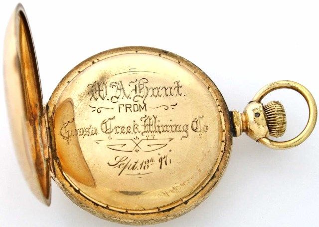 inscribed WA Hunt from Coosa Creek Mining Co. Sept. 18, 1897. Watch is Hunter case in style with nicely decorated enamel face, 15 jewels, SN 6985460, inner case marked 2 plates 14K gold over fine hard metal, wear for 20 years. Watch runs perfectly at time of description. History of Gold first found in 1832 is interesting and it's been said the "Yellowist Gold" has been found in Coosa Creek. Est. 600-1200