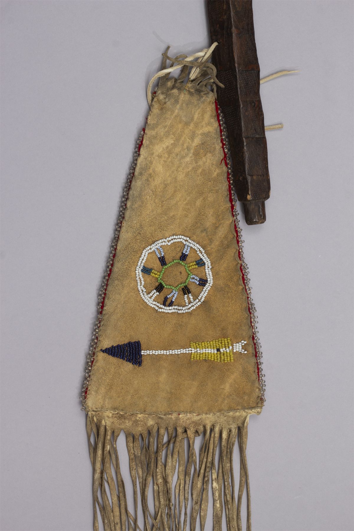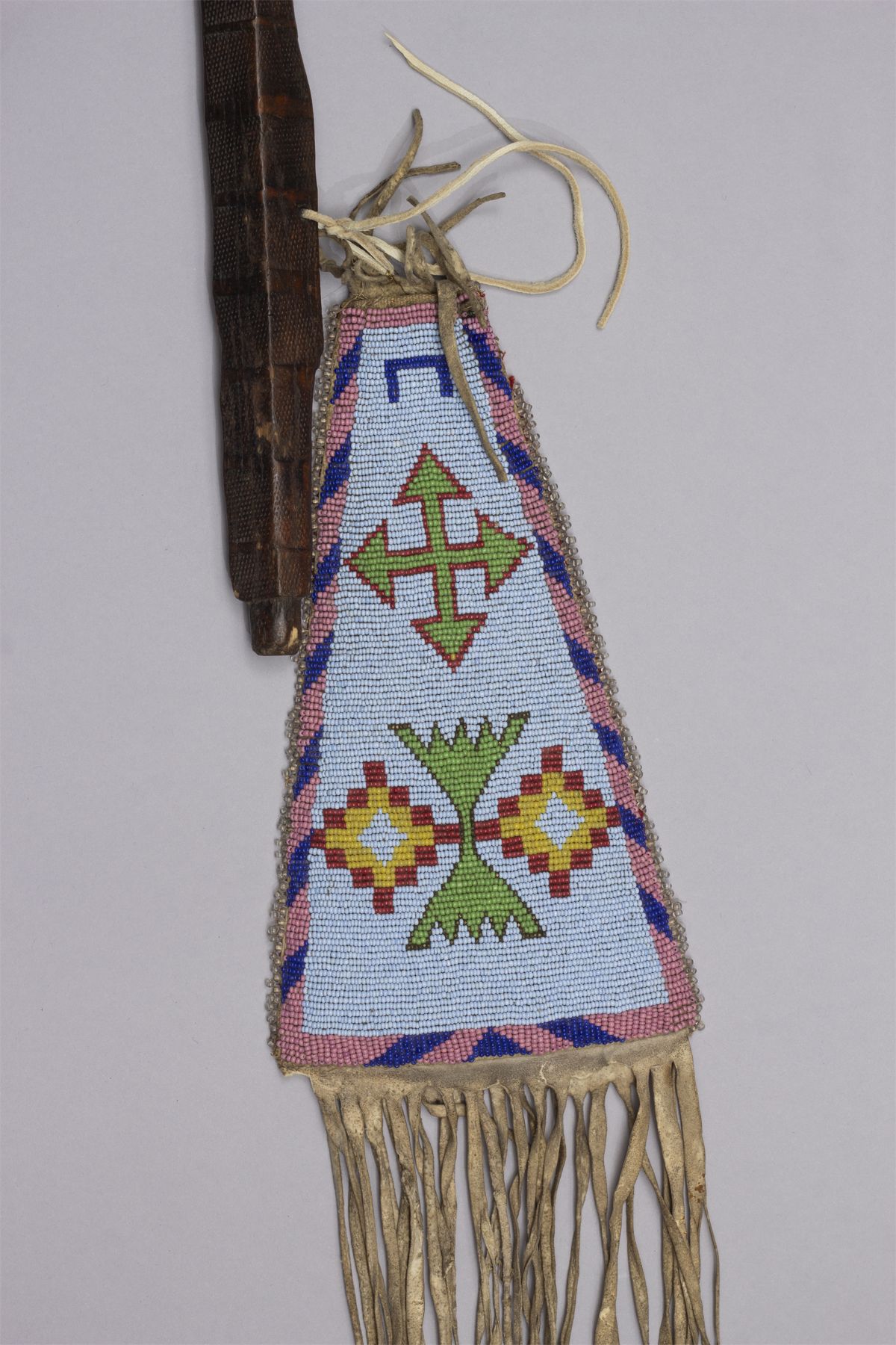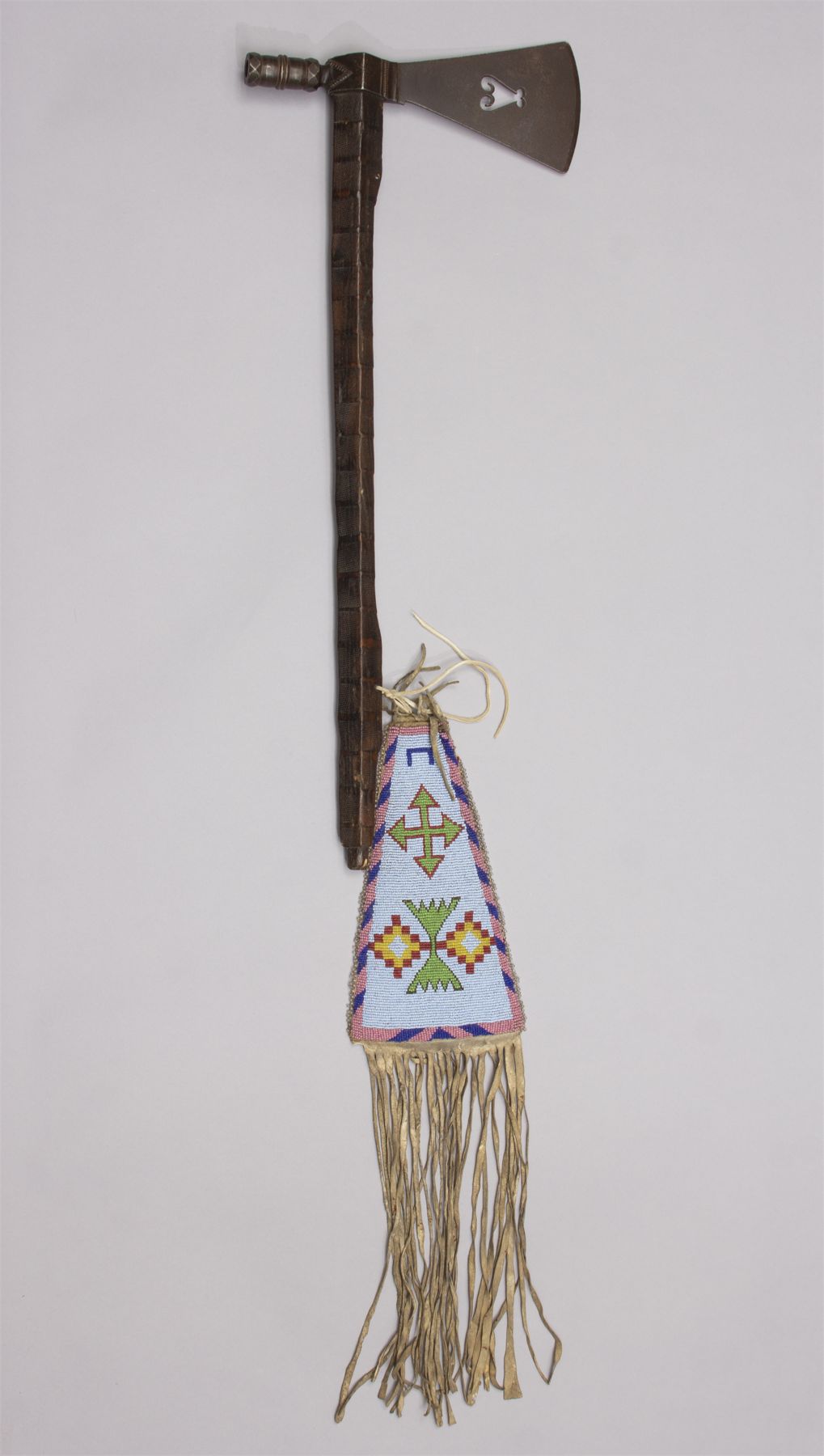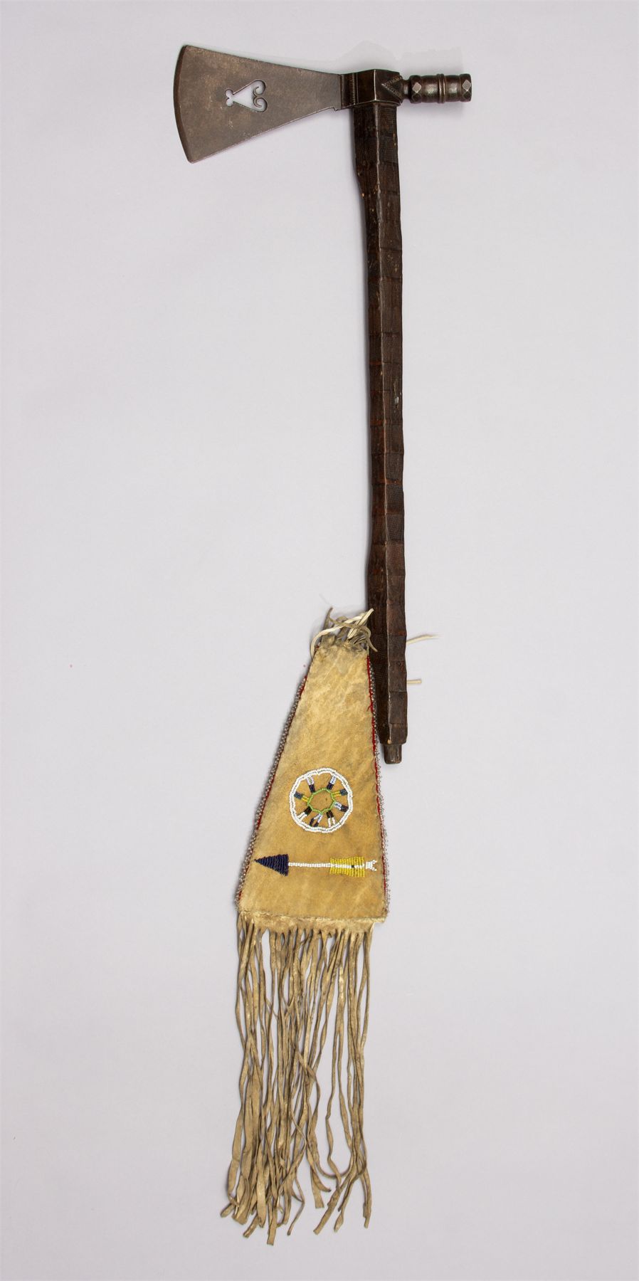 Presentation Pipe Tomahawk with Scroll Heart Cutout and File burn haft, Ca. 19th century. Beautiful file branded hardwood haft with beaded fall. Heavy iron blade with scrolled heart cutout and pipe bowl in an octagon design. Beaded fall with shield and arrow on one side and fully beaded with a light blue background and geometric designs in navy, brown, green with pink and navy trim. Accented with long fringe.
