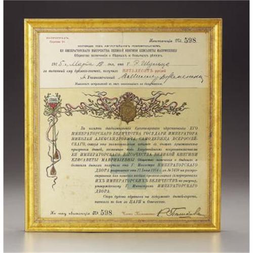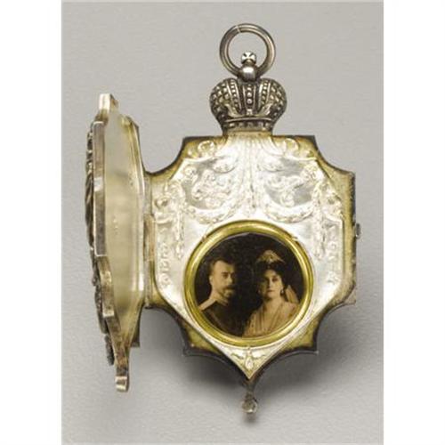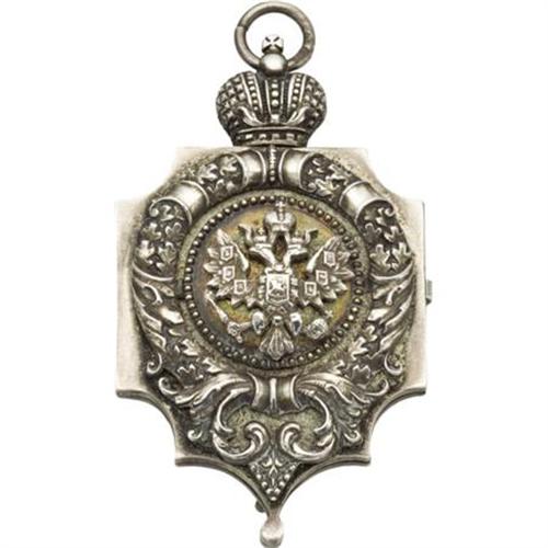 <B>Russian Imperial Presentation Silver Badge of Honor in Original Fitted Box Commemorating the 20th Anniversary of the Nuptials of Emperor Nicholas II and Alexandra Fedorovna, with award document to F. Shulitse, Dated March 15, 1915</B></I><BR><I>Stamped Moscow 1908-17</B></I><BR><BR>Designed as a silver shield-shaped locket surmounted by the Russian Imperial crown, the center with applied Romanov double-headed eagle within a wreath, opening to reveal the crowned ciphers of Nicholas and Alexandra above a photograph of the Imperial couple with the dates 1894 and 1914-2 in. high including suspension ring; award-8 1/4 x 7 1/2 in. <BR><BR>Provenance:<BR>Armoury of St. James, London<BR><BR><b>Shipping:</b> Requires 3rd Party Shipping (<a target="_blank" href="http://www.heritageauctions.com/common/shipping.php">view shipping information</a>)