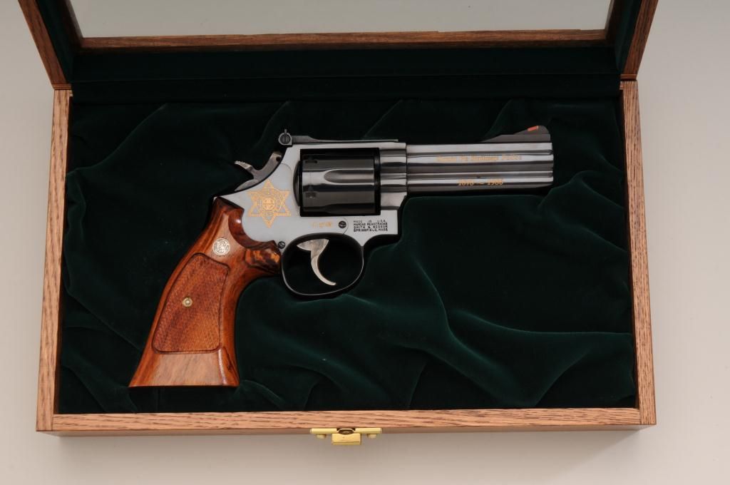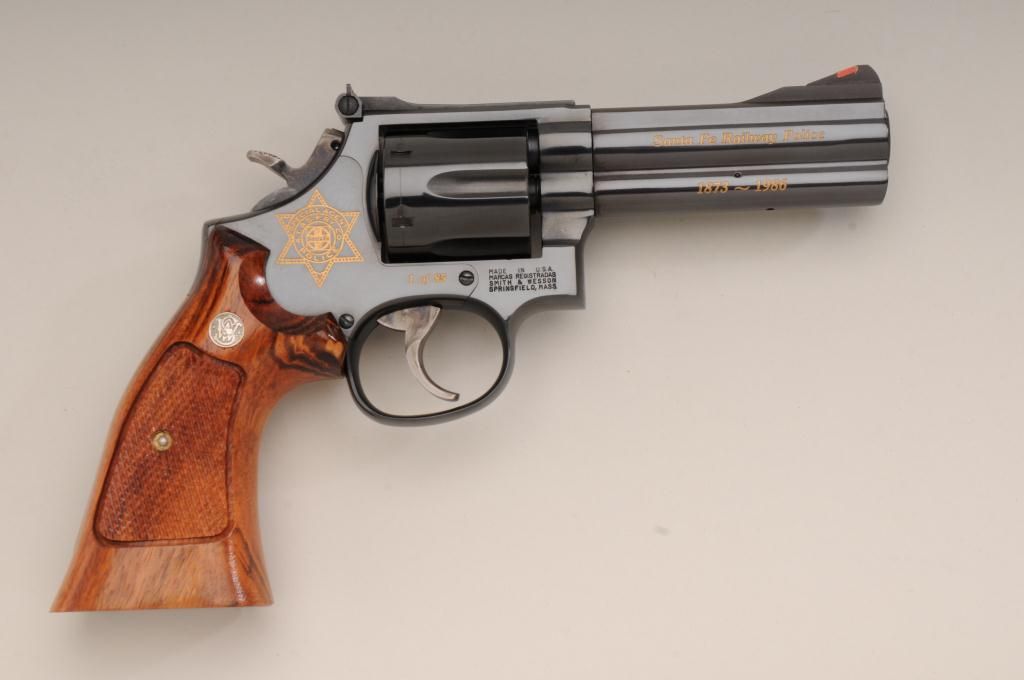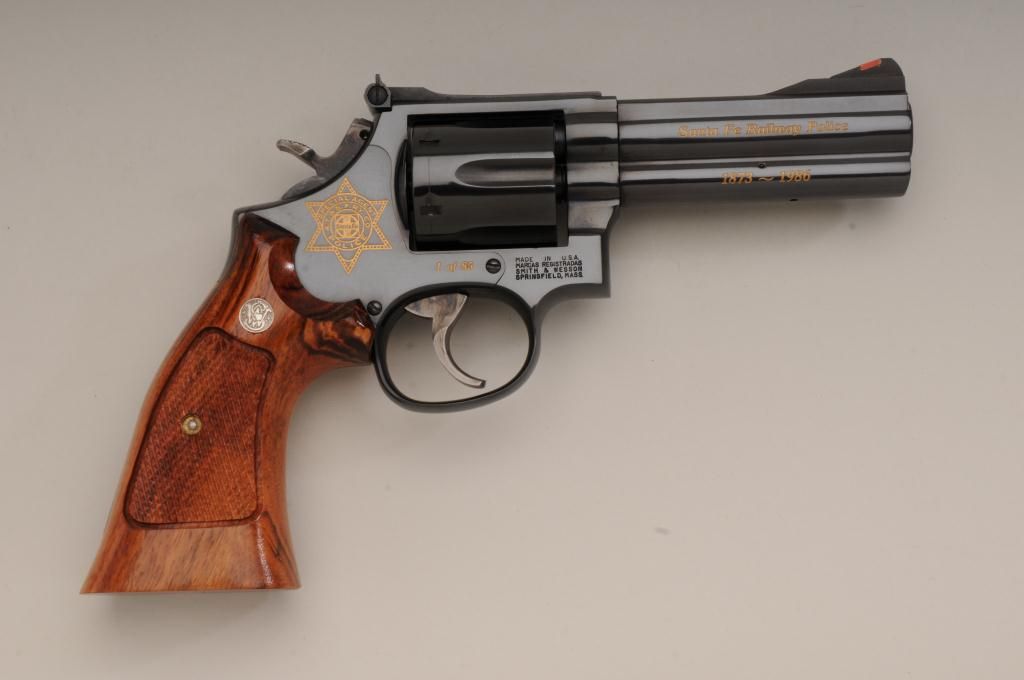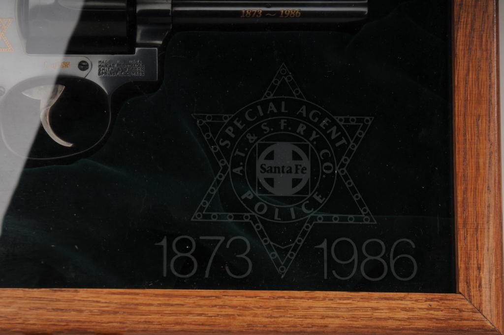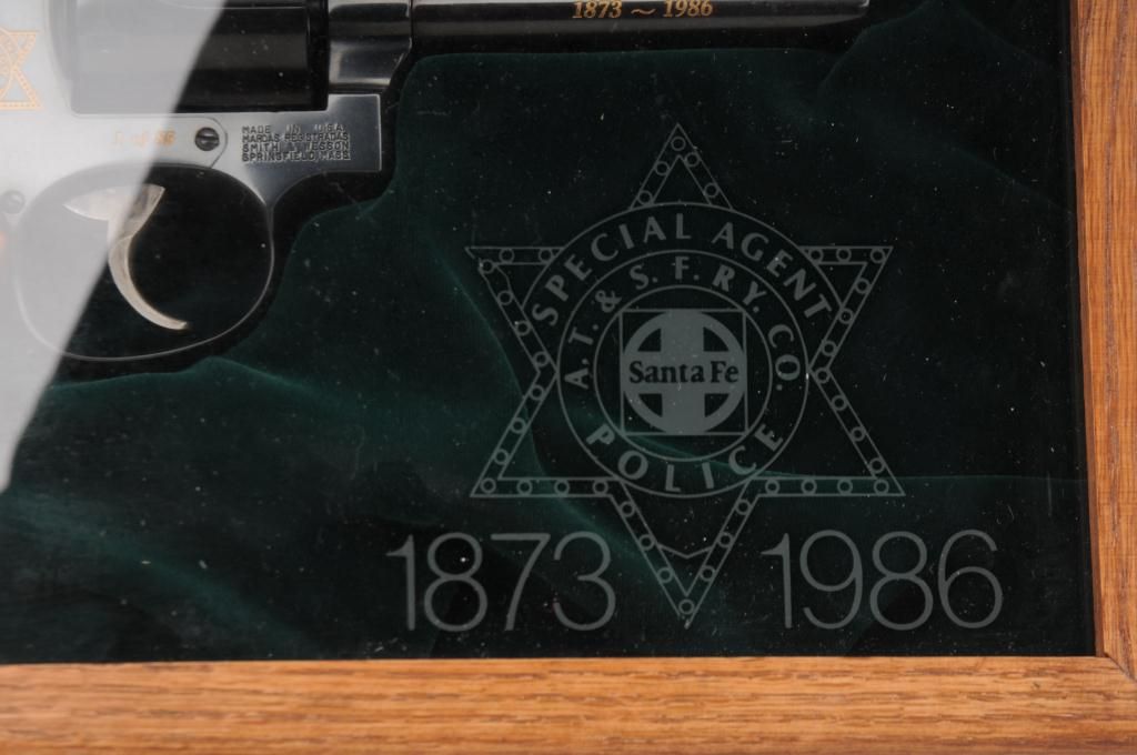 Presentation Smith & Wesson Model 586 DA revolver in wood and glass display case, .357 Magnum cal., 4” barrel, blue finish, checkered combat wood medallion grips, 1 of 85 produced for the Santa Fe Railway Police,#AUN4682. This gun is in like new condition showing little handling; just a slight cylinder drag line; left side of frame ornamented in gold “Special Agent”; right side of frame ornamented in gold with badgeinsignia of A.T. & S. F. RY. Co. Police and “1 of 85”; right side of barrel gold ornamented “Santa Fe Railway Police” and “1873 – 1986”. The display case is in fine condition and the glass is etched with theS.F. RY Police badge and commemorative years. The only one of this very limited edition law enforcement commemoratives this cataloger has ever seen. From the Texas collection of Eddie Glover, Jr. Est.: $600-$1,200.