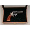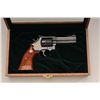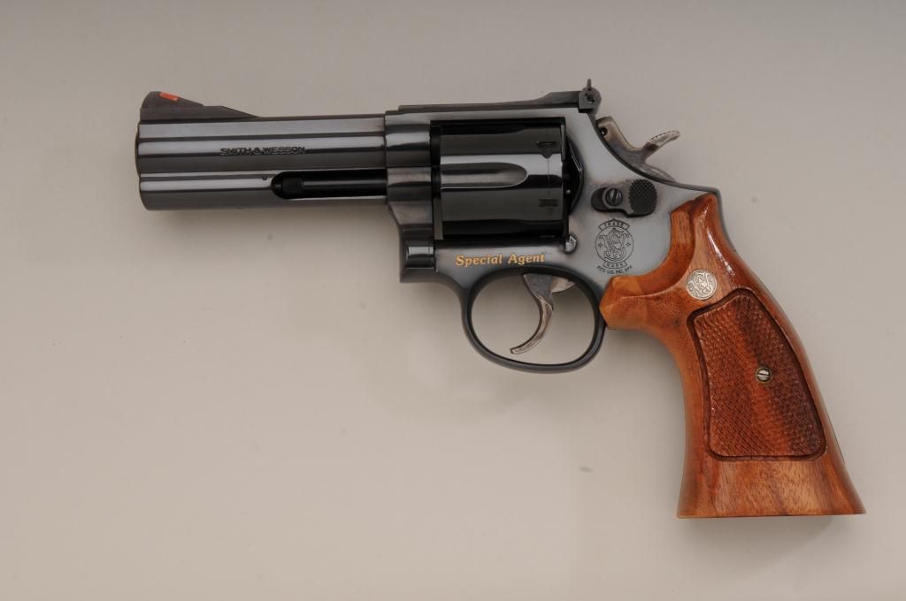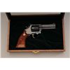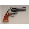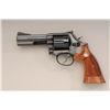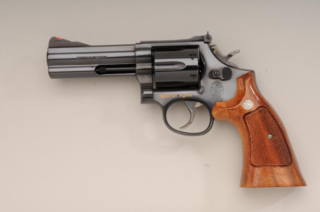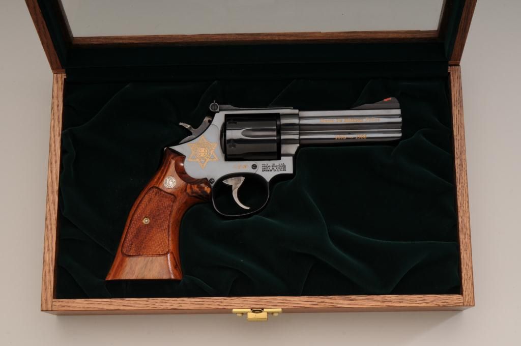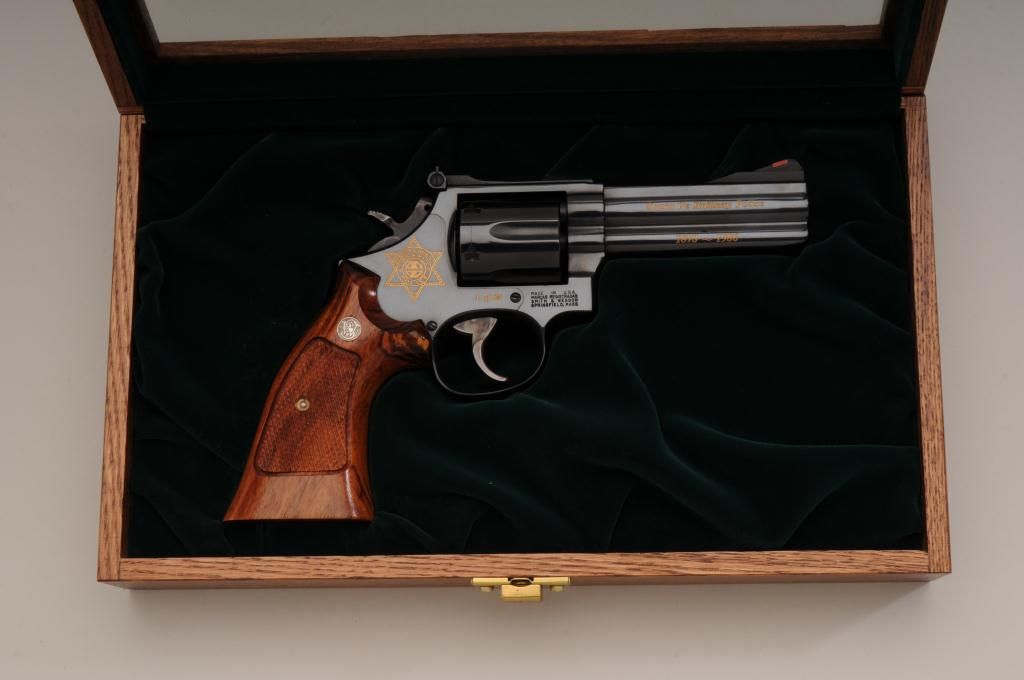 Presentation Smith & Wesson Model 586 DA revolver in wood and glass display case, .357 Magnum cal., 4” barrel, blue finish, checkered combat wood medallion grips, 1 of 85 produced for the Santa Fe Railway Police,#AUN4682. This gun is in like new condition showing little handling; just a slight cylinder drag line; left side of frame ornamented in gold “Special Agent”; right side of frame ornamented in gold with badgeinsignia of A.T. & S. F. RY. Co. Police and “1 of 85”; right side of barrel gold ornamented “Santa Fe Railway Police” and “1873 – 1986”. The display case is in fine condition and the glass is etched with theS.F. RY Police badge and commemorative years. The only one of this very limited edition law enforcement commemoratives this cataloger has ever seen. From the Texas collection of Eddie Glover, Jr. Est.: $600-$1,200.