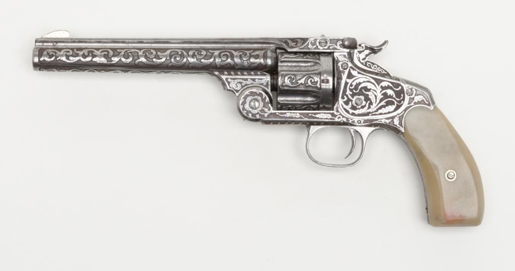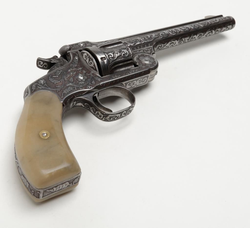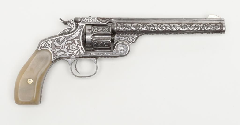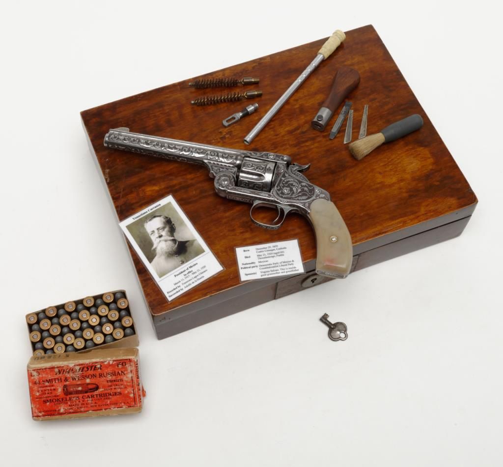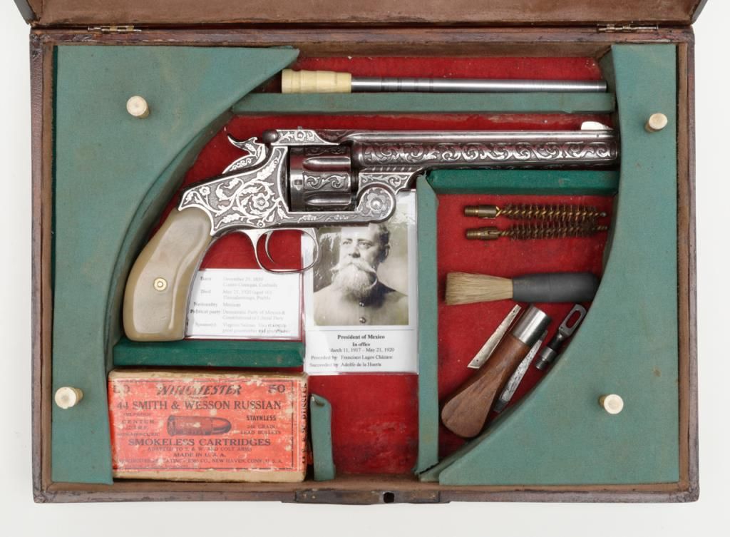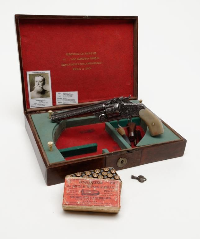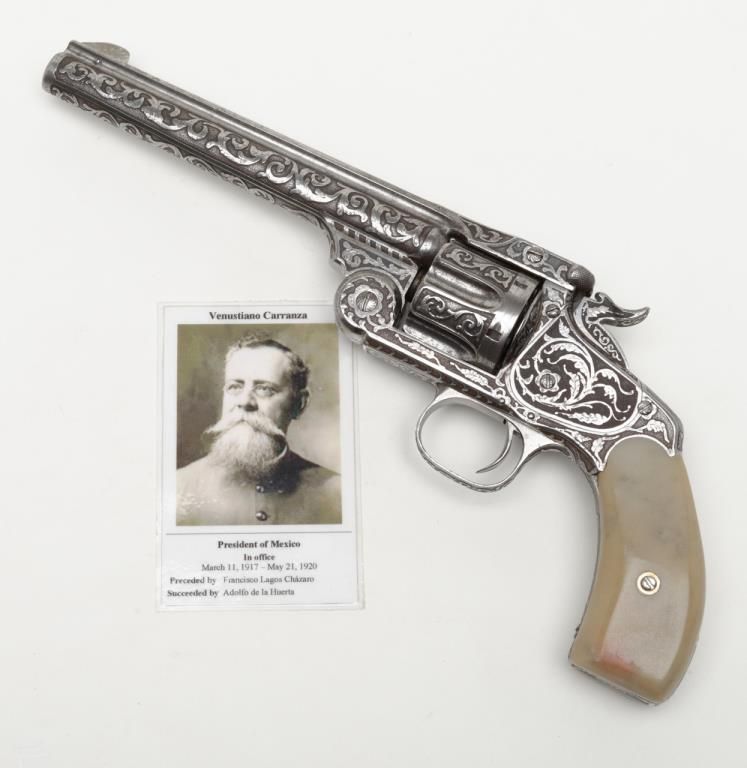 Presentation Smith & Wesson New Model No. 3 Single Action revolver to Venustiano Carranza in 1915 as President of the temporary Mexican Government, during the height of the Mexican Revolution; .44 Russian cal., 6-1/2” barrel, profusely and deeplynon-factory floral and vine scroll engraved (likely accomplished in Mexico) with Mexican variegated Onyx grips, #19299 (all matching) with Carranza’s name engraved on either side of the frame under the grips. Factory letter accompaniesthis lot, dated May 20, 2009, indicating gun shipped from factory on May 19, 1883 to M. W. Robinson, New York City, N.Y. (S&W’s largest distributor), confirming barrel length and indicating original shipment in blue finish withcheckered black hard rubber grips, 40 guns of same configuration in shipment. This gun is in overall very good condition with beautiful engraving, crisp action, sharp markings and beautiful Onyx grips. It is contained in a wood presentation case that is lined in red and green material with gold lettering inside the lid “PRESENTADO A EL PRESIDENTE VENUSTIANO CARRANZA 6 ENERO 191_ AGRADFCIMENTO POR LA RESTAURACION PUEBLOS DE EJIDOS” and includes various cleaning tools, a key