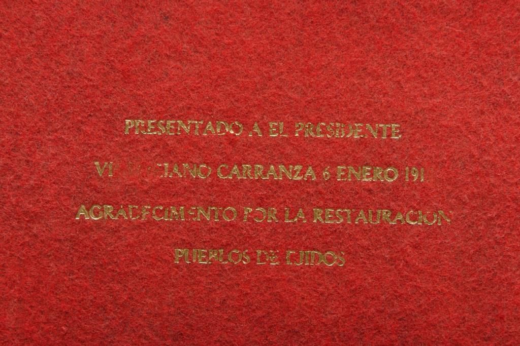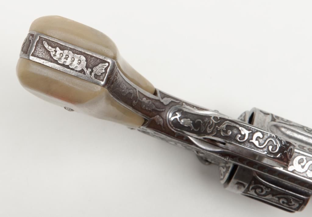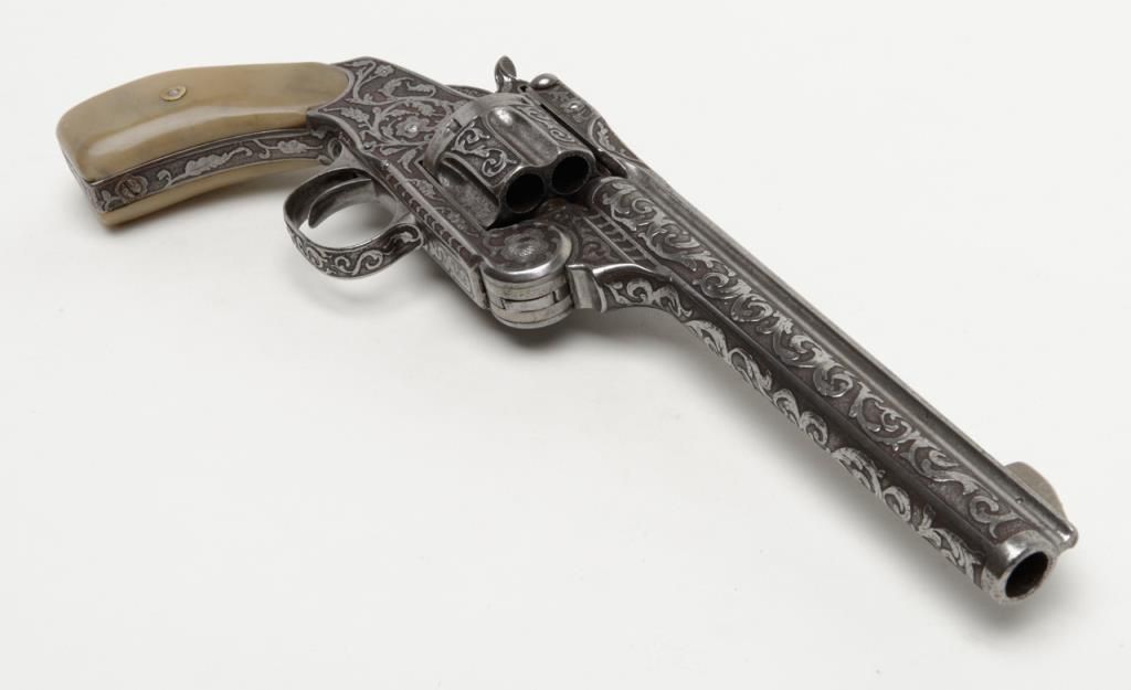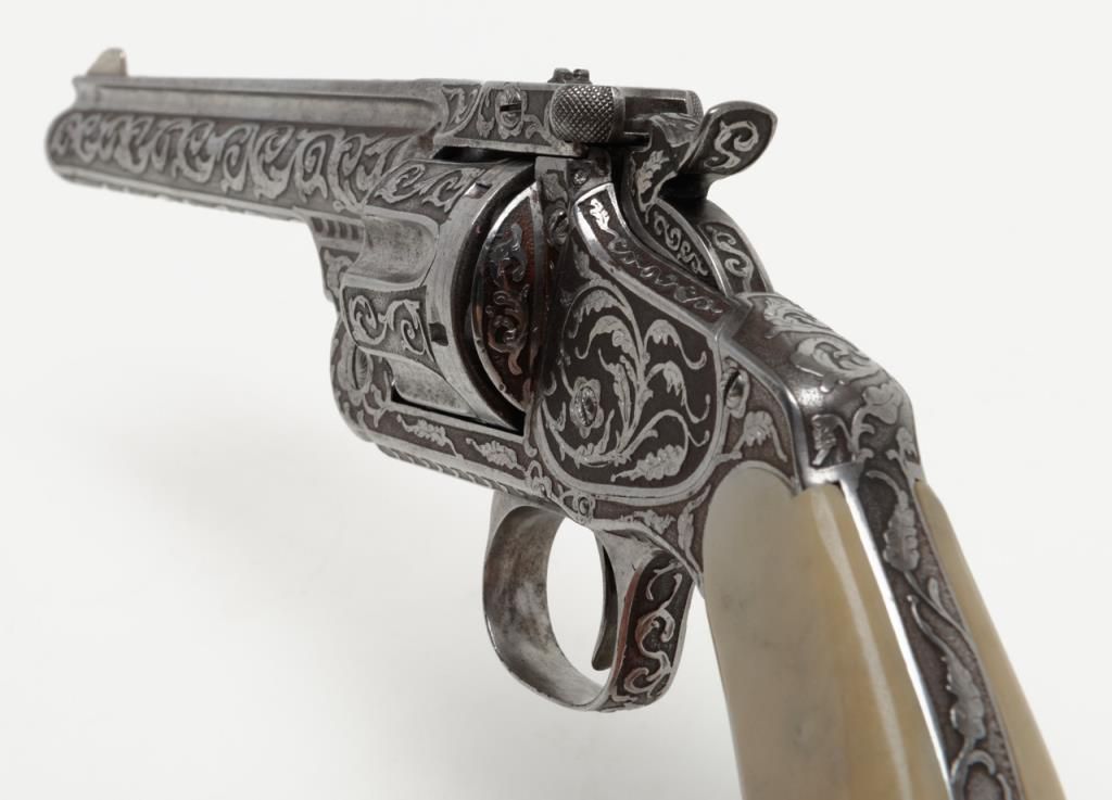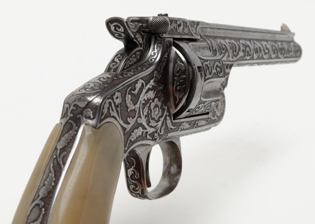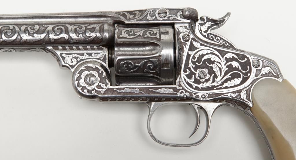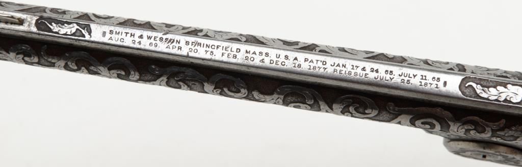 Presentation Smith & Wesson New Model No. 3 Single Action revolver to Venustiano Carranza in 1915 as President of the temporary Mexican Government, during the height of the Mexican Revolution; .44 Russian cal., 6-1/2” barrel, profusely and deeplynon-factory floral and vine scroll engraved (likely accomplished in Mexico) with Mexican variegated Onyx grips, #19299 (all matching) with Carranza’s name engraved on either side of the frame under the grips. Factory letter accompaniesthis lot, dated May 20, 2009, indicating gun shipped from factory on May 19, 1883 to M. W. Robinson, New York City, N.Y. (S&W’s largest distributor), confirming barrel length and indicating original shipment in blue finish withcheckered black hard rubber grips, 40 guns of same configuration in shipment. This gun is in overall very good condition with beautiful engraving, crisp action, sharp markings and beautiful Onyx grips. It is contained in a wood presentation case that is lined in red and green material with gold lettering inside the lid “PRESENTADO A EL PRESIDENTE VENUSTIANO CARRANZA 6 ENERO 191_ AGRADFCIMENTO POR LA RESTAURACION PUEBLOS DE EJIDOS” and includes various cleaning tools, a key
