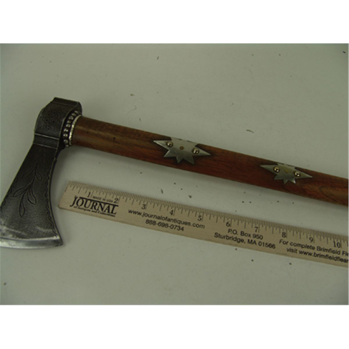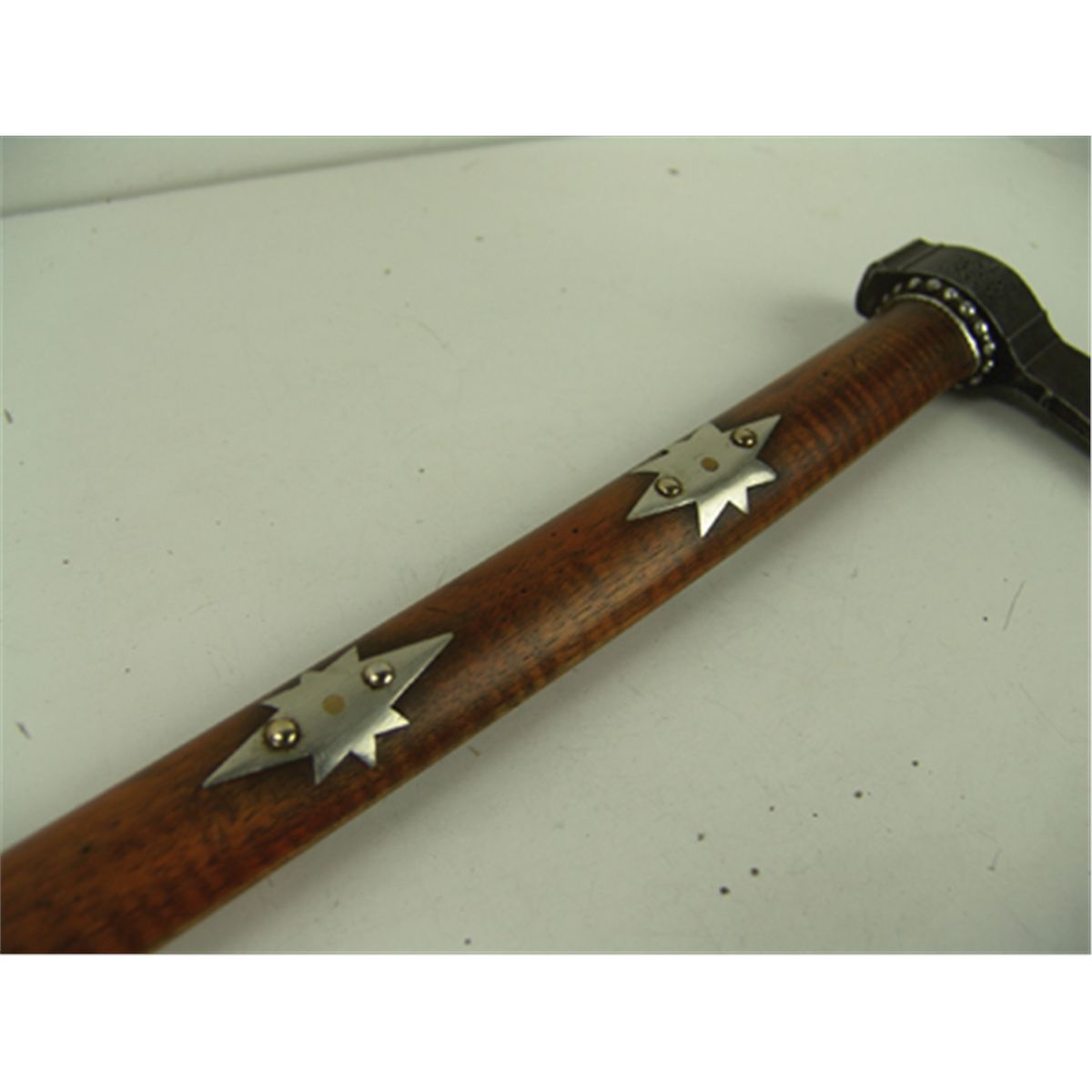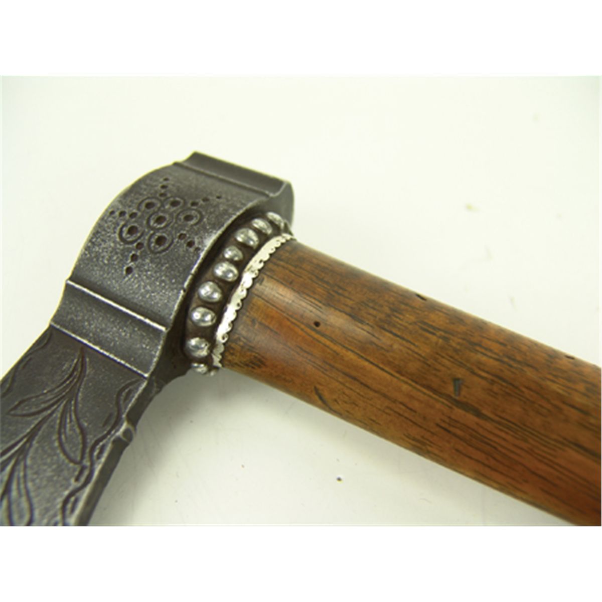 Late 1900s, Fantastic iron axe head with incised designs on a hard wood stem ingraved with silver medallions and with silver covered end and brass tacks. Very good condition, a true show piece. 23"