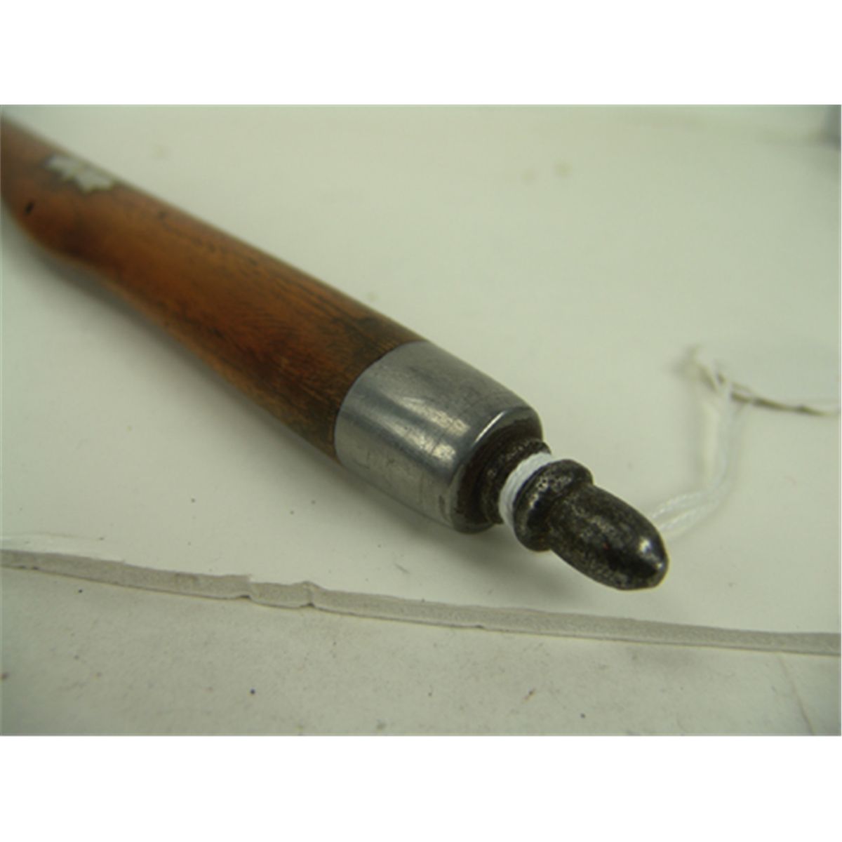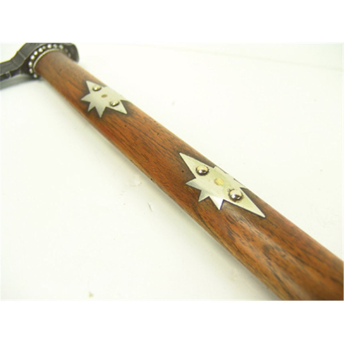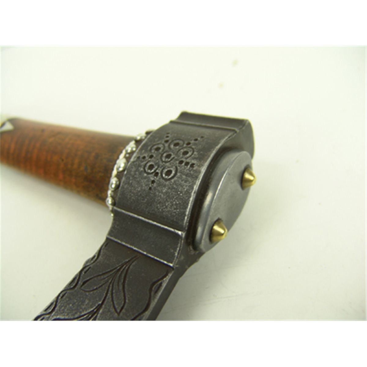 Late 1900s, Fantastic iron axe head with incised designs on a hard wood stem ingraved with silver medallions and with silver covered end and brass tacks. Very good condition, a true show piece. 23"