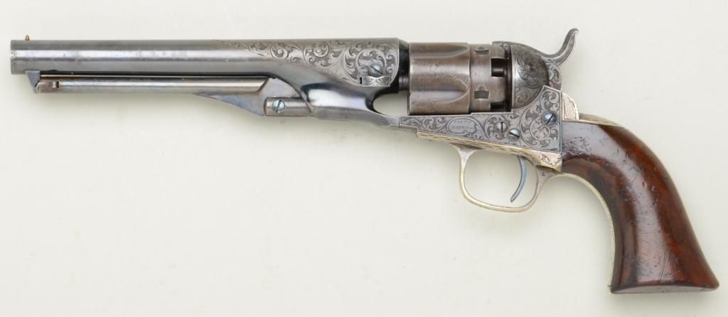 Presentation cased engraved Colt Model 1862 Police percussion revolver, .36 cal., 6-1/2” barrel, blue and case hardened finish, wood grips, #3436. This gun is in overall fine condition showing approx. 75-85% plusoriginal blue finish on the barrel assembly with balance gone to a pleasing patina; traces of original blue in protected areas of fluted cylinder; considerable muted original case colors on the frame and hammer withvivid case colors on the rammer; the majority of original silver plating remains on the engraved trigger guard and backstrap; hand cut Colt’s Patent on the left side of the frame; hammer is engraved with classic wolf’s head design and dog’s head is incorporated into the engraving of the barrel on the left side above the barrel wedge; all matching visible serial numbers including period markings that indicate special handling;grips are very good to fine with some old scattered mars from storage. The casing is in overall very good to fine original condition showing an old age crack in the lid along the graining; interior is original and very