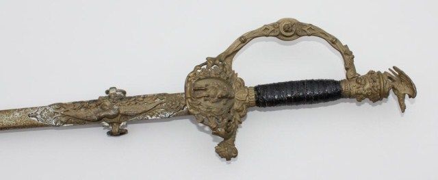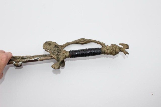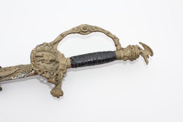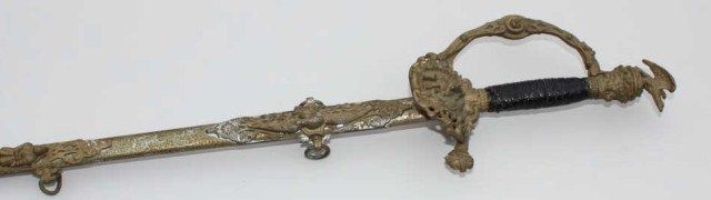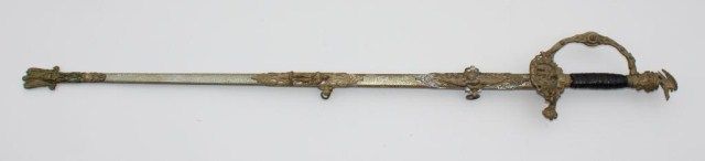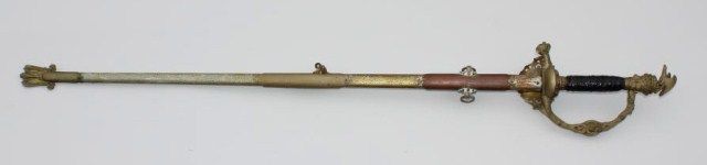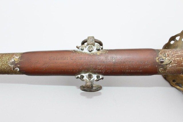 Presentation grade and inscribed Model 1860 Officer’s sword with ornate cast in high relief figural mounts recently discovered and in “out-of-the-attic” condition. The scabbard is inscribed “Presented to ColonelEdward B. Knox by the Officers and Men of the 1st Infantry, I.N.G. as a slight testimonial of their appreciation of his zeal and untiring labor in the behalf of the Regiment, Sept. 16, 1884”. The pommel cap is anAmerican Eagle in high relief with fancy guard showing Knight on horseback at center; the thumb guard also shows Knight’s head; the scabbard shows a high relief Eagle with shield and wreaths holding the top ring andthe bottom ring is held by a similar pierced mount with high relief Knight in armor. The drag shows fancy stand-of-arms. The inscription and mounts are dirty, rusty and completely uncleaned and untouched. The blade shows Colonel E. B. Knox etched on one side and Thompson & Wetmore, Chicago, Ill dealers name on reverse; blade is very good + and may clean to excellent. The grip shows wrapping with black tape over wire and leather.
