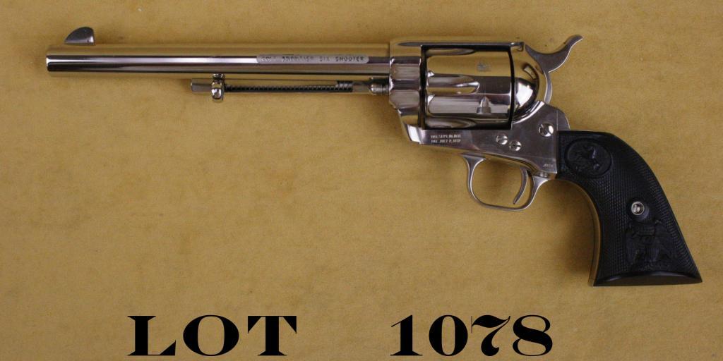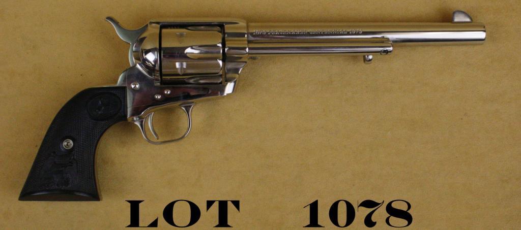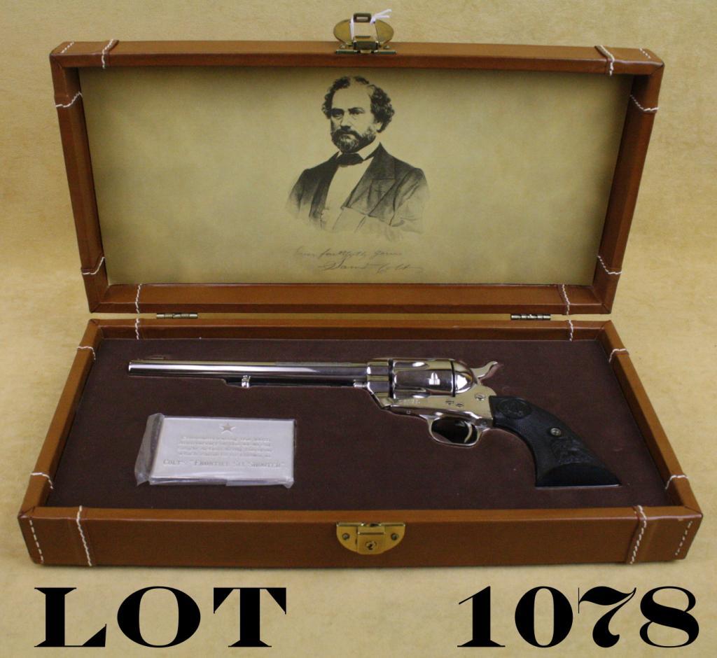 Presentation leather covered cased Colt Centennial Peacemaker SAA revolver, 44-40 cal., 7-1/2” barrel, nickel finish, checkered black eagle head hard rubber grips, #1116PC. This gun is in like new condition showingjust a slight drag line on the cylinder, otherwise minty; accompanied by Colt fitted presentation tan leather covered case with brown lining, likeness of Col. Colt in the interior side of the lid and “Colt’s Frontier Six Shooter” metal plaque inside case. Est.: $1,800-$2,800.