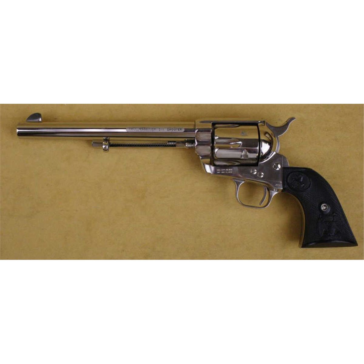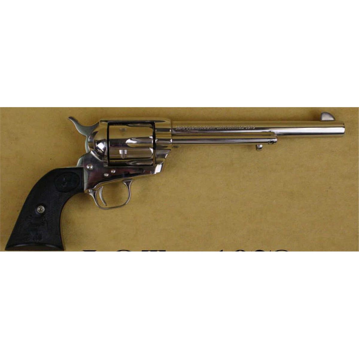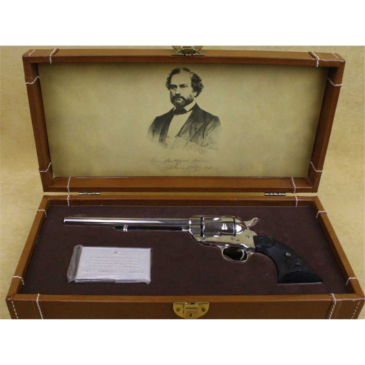 Presentation leather covered cased Colt Centennial Peacemaker SAA revolver, 44-40 cal., 7-1/2” barrel, nickel finish, checkered black eagle head hard rubber grips, #1116PC. This gun is in like new condition showingjust a slight drag line on the cylinder, otherwise minty; accompanied by Colt fitted presentation tan leather covered case with brown lining, likeness of Col. Colt in the interior side of the lid and “Colt’s Frontier Six Shooter” metal plaque inside case. Est.: $1,800-$2,800.