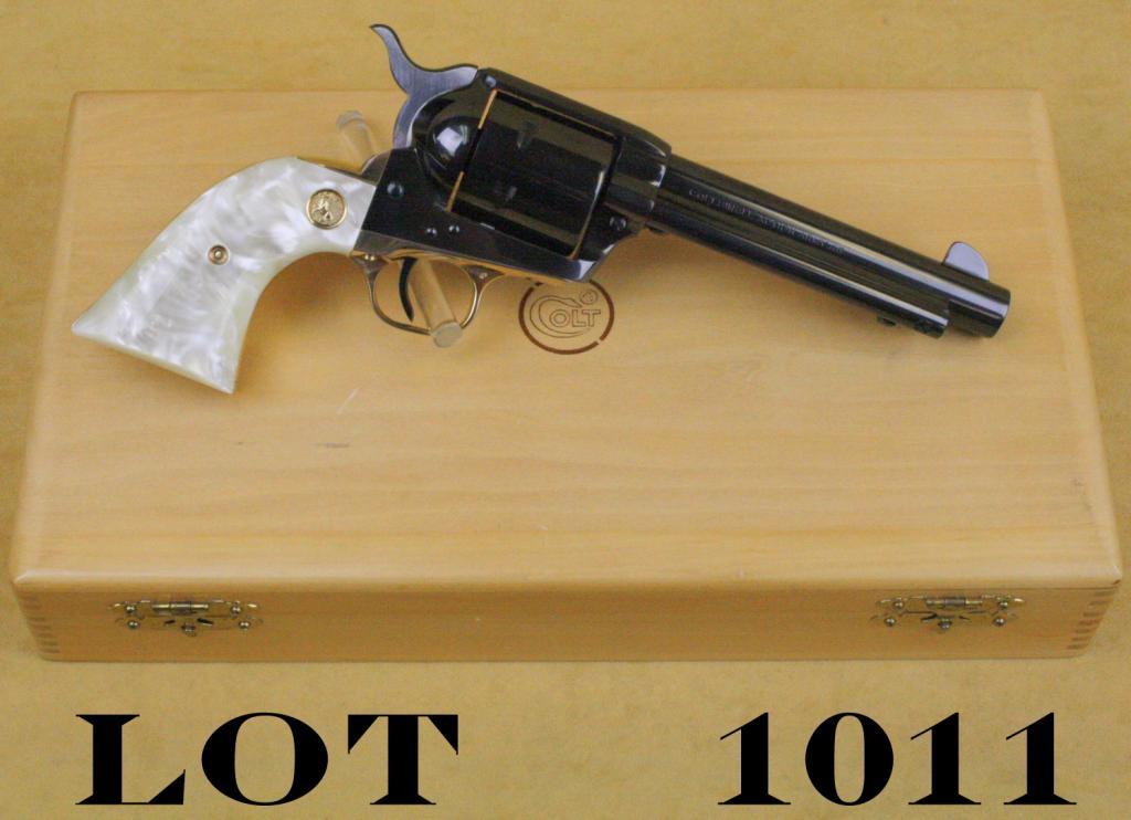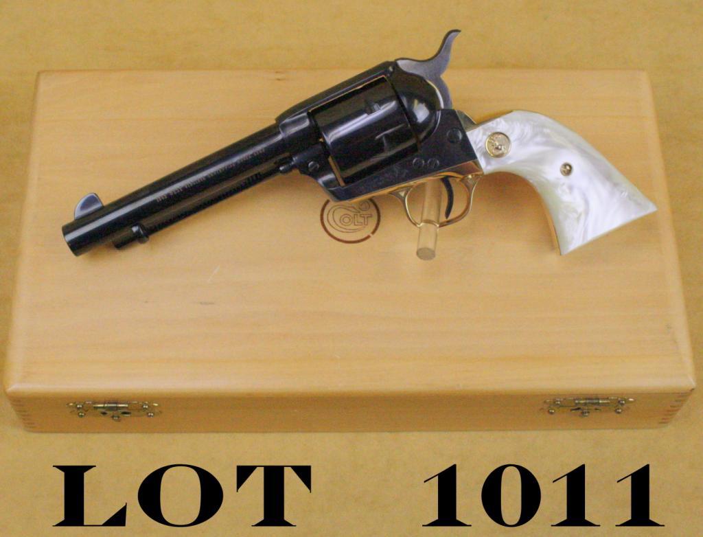 Presentation lined wood cased West Virginia Centennial Model Colt SAA revolver, .45 cal., 5-1/2” barrel, blue finish, non-fluted cylinder, gold accented trigger guard and back strap, faux pearl Colt medallion grips,#98WVC. This gun is in like new condition showing little handling; box is in very good to fine condition with just a couple mars from storage; made circa 1963. Est.: $700-$1,400.