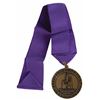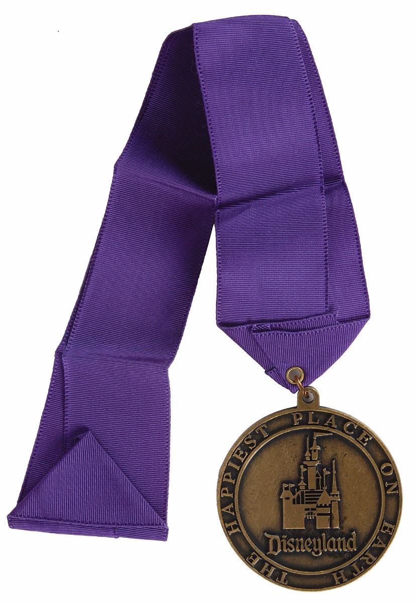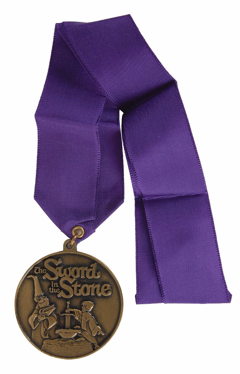Scarce original Sword in the Stone presentation medal from Disneyland, measuring 2.5? in diameter, suspended from its original purple ribbon. The front features a raised image of Merlin and Arthur attempting to pull the sword from the anvil, and the reverse bears the Disneyland logo encircled with text, “The Happiest Place on Earth.” In fine condition. These medals were presented during a beloved Fantasy Land ceremony to a young volunteer at the park who would help Merlin remove the sword and be proclaimed ‘Ruler of the Realm.’ Medals from this now defunct ceremony were not available for sale at any of the parks and are now quite uncommon.