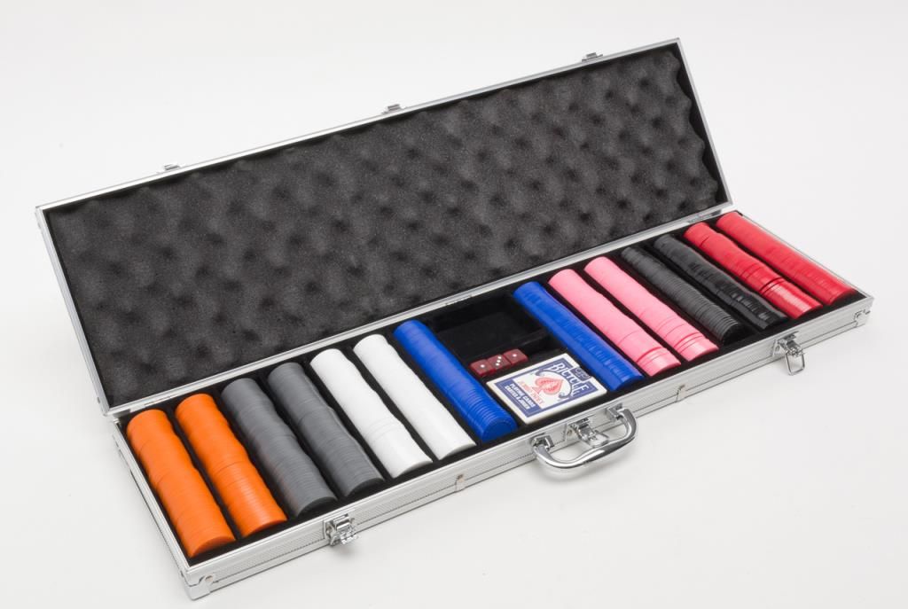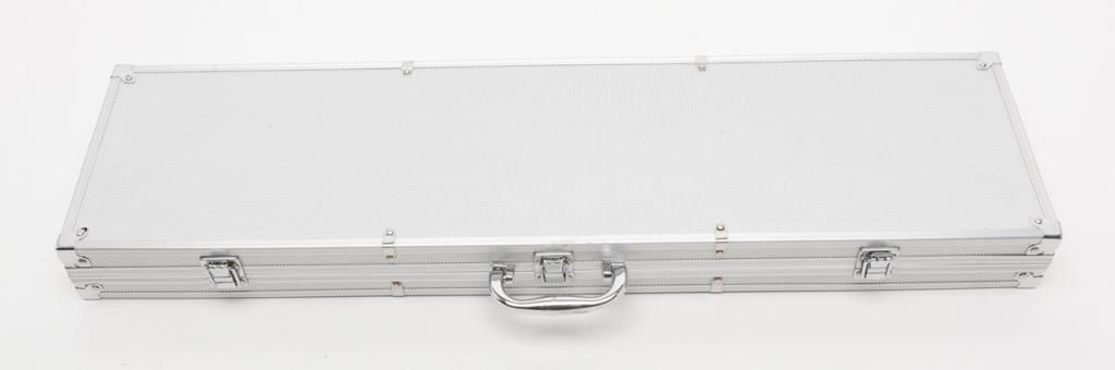 Presentation poker chip set in padded steel suitcase style carry-all, approx. 30” x 8-1/2” x 3”; in overall fine condition; missing one deck of cards. Est.: $150-$300.