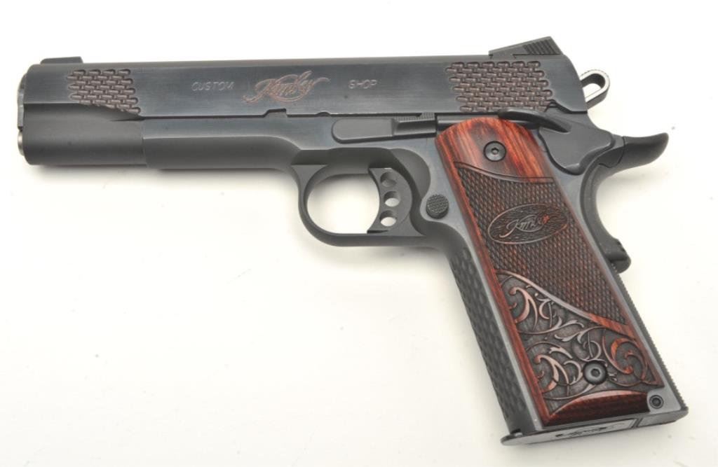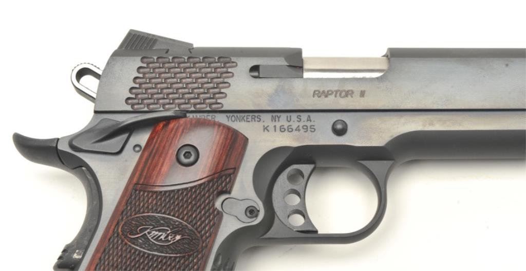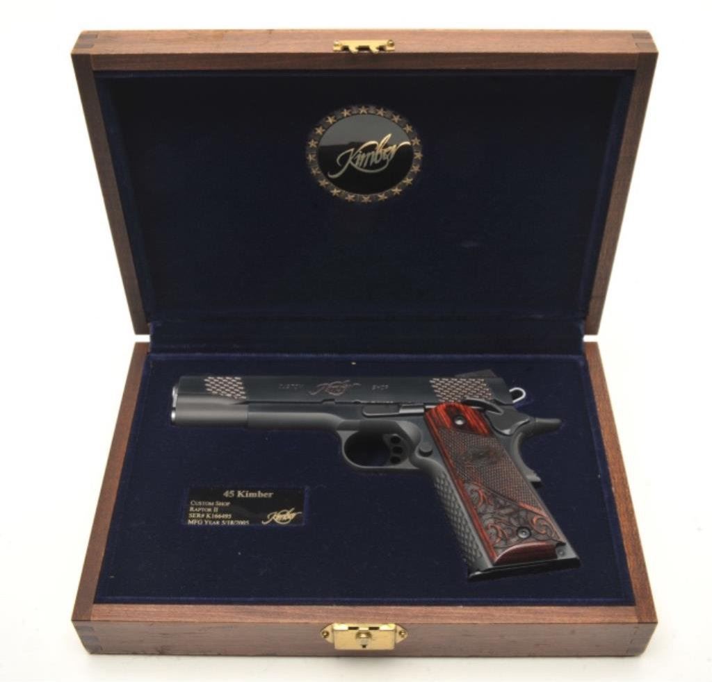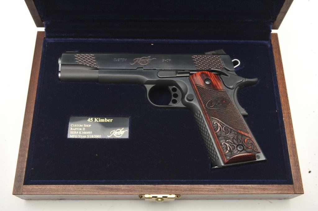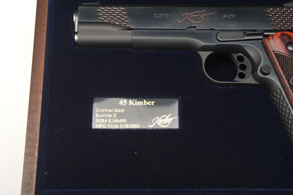 Model, .45 caliber, 5” barrel, blued finish, custom checkered wood grips, special slide, hammer and trigger, S/N K166495, in overall near new condition. Accompanied by Kimber hard carry case. (Modern/PPT). Est.: $1,250-$2,500.