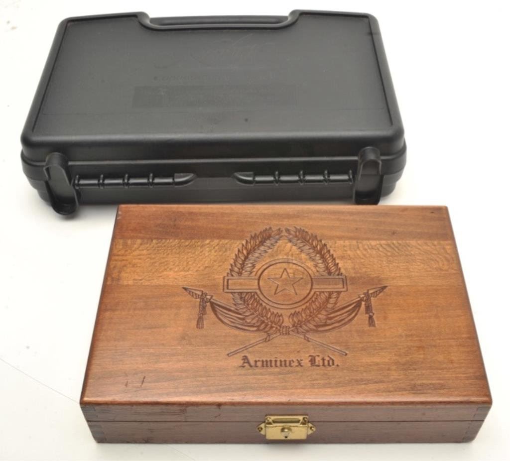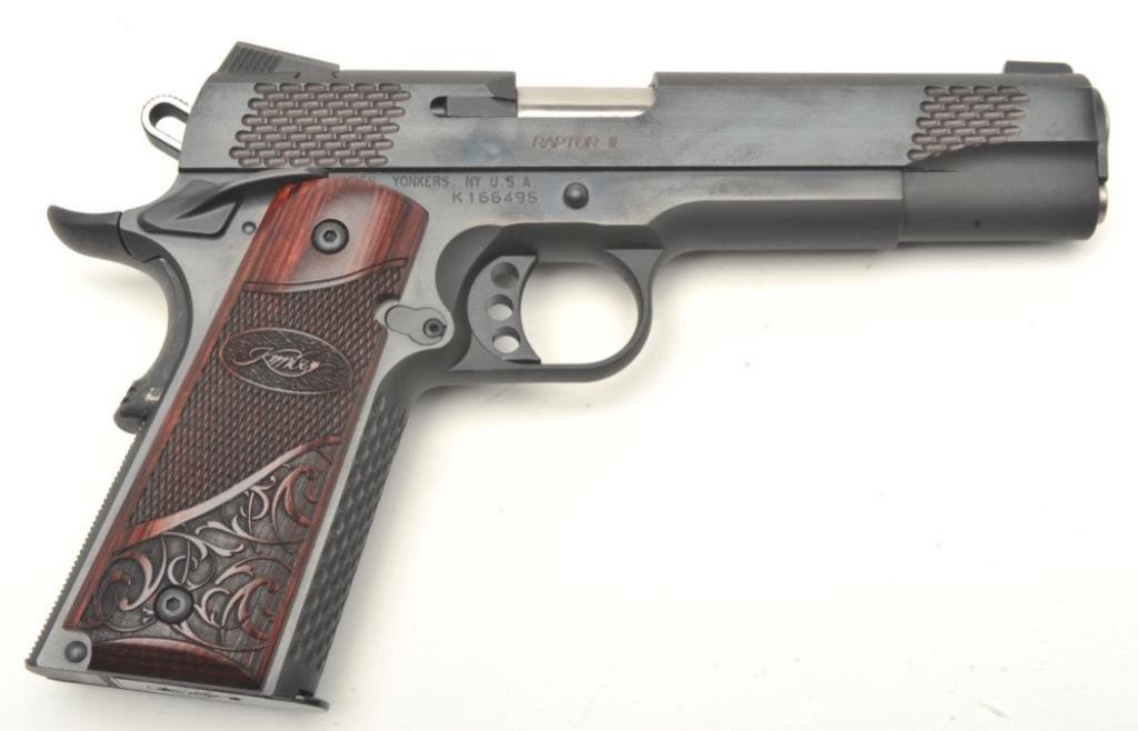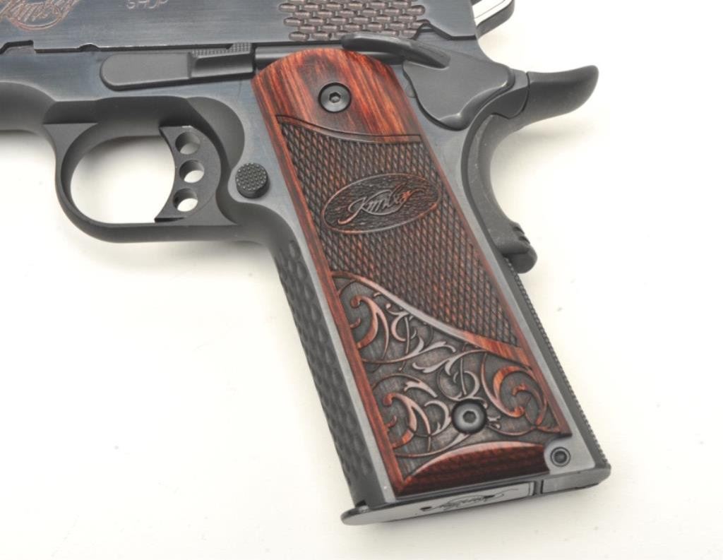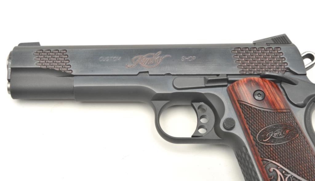 Model, .45 caliber, 5” barrel, blued finish, custom checkered wood grips, special slide, hammer and trigger, S/N K166495, in overall near new condition. Accompanied by Kimber hard carry case. (Modern/PPT). Est.: $1,250-$2,500.