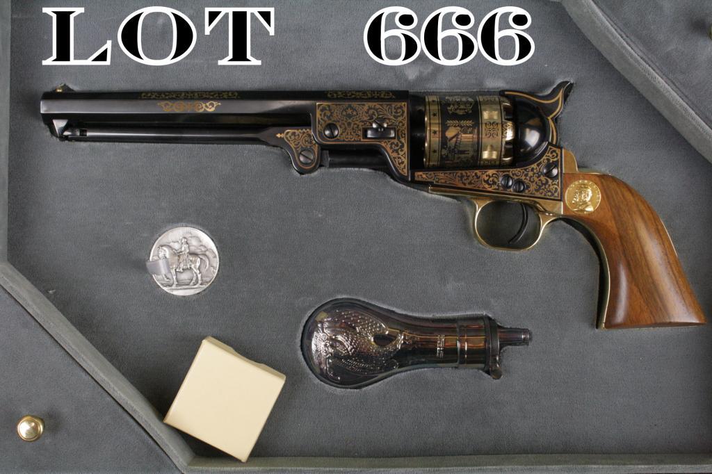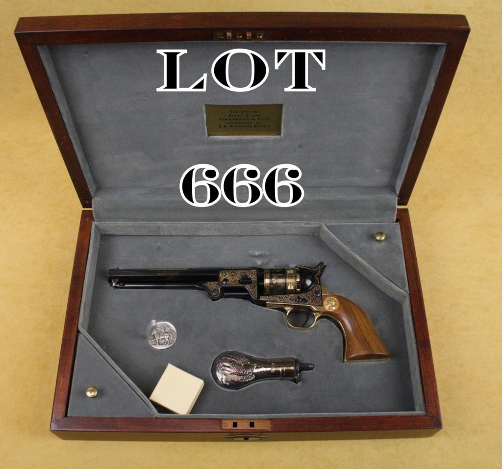 Presentation wood cased with accessories Italian-made copy of a Colt Model 1851 Navy percussion revolver authorized by the U.S. Historical Society entitled “The Official Robert E. Lee Commemorative Pistol”, .36cal., 7-1/2” octagon barrel, blue finish with gold ornamentation on the frame, cylinder and barrel assembly; brass trigger guard and back strap, wood grips with inset of Robert E. Lee on the top of the left grip, #480.This gun is in like new condition and is nicely ornamented with images of the Confederate White House, Lee’s Mansion, Lee on his favorite horse, etc. The box is gray lined with two covered compartments, an inset powder flask and commemorative inset coin. The wood case is in excellent condition with inset panel on the lid showing Lee on his horse with fancy bordering. Est.: $650-$1,250.