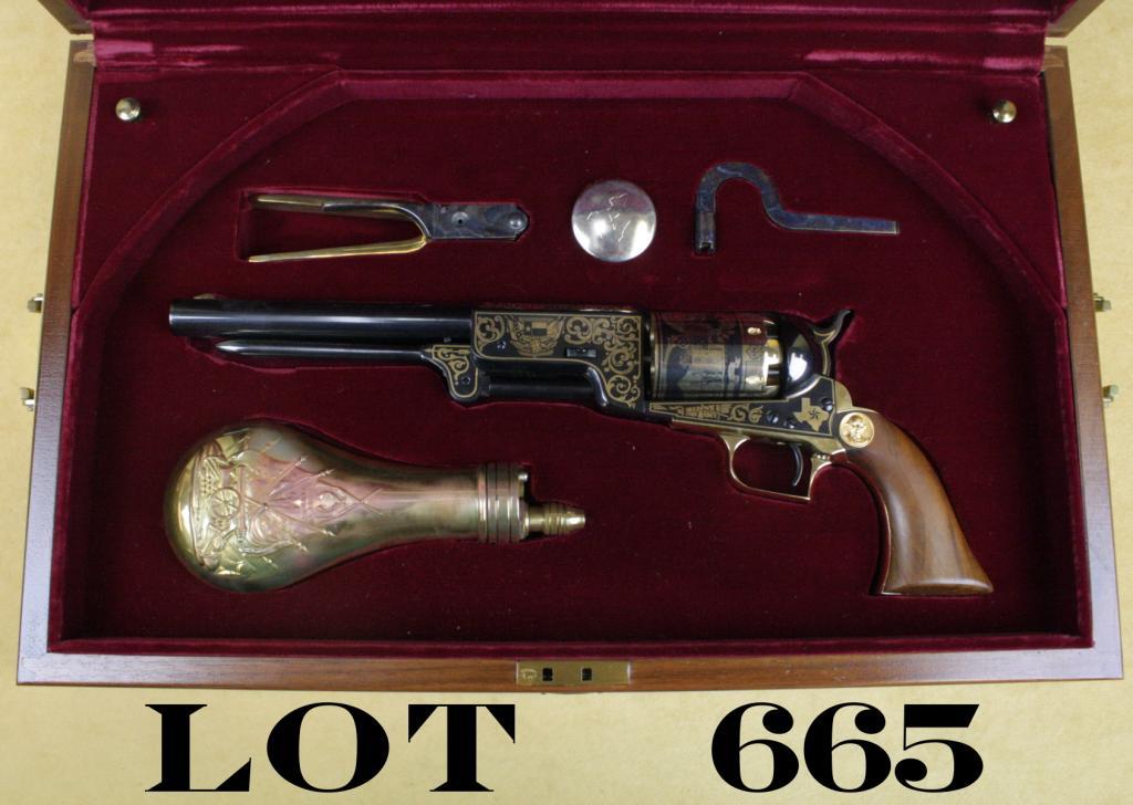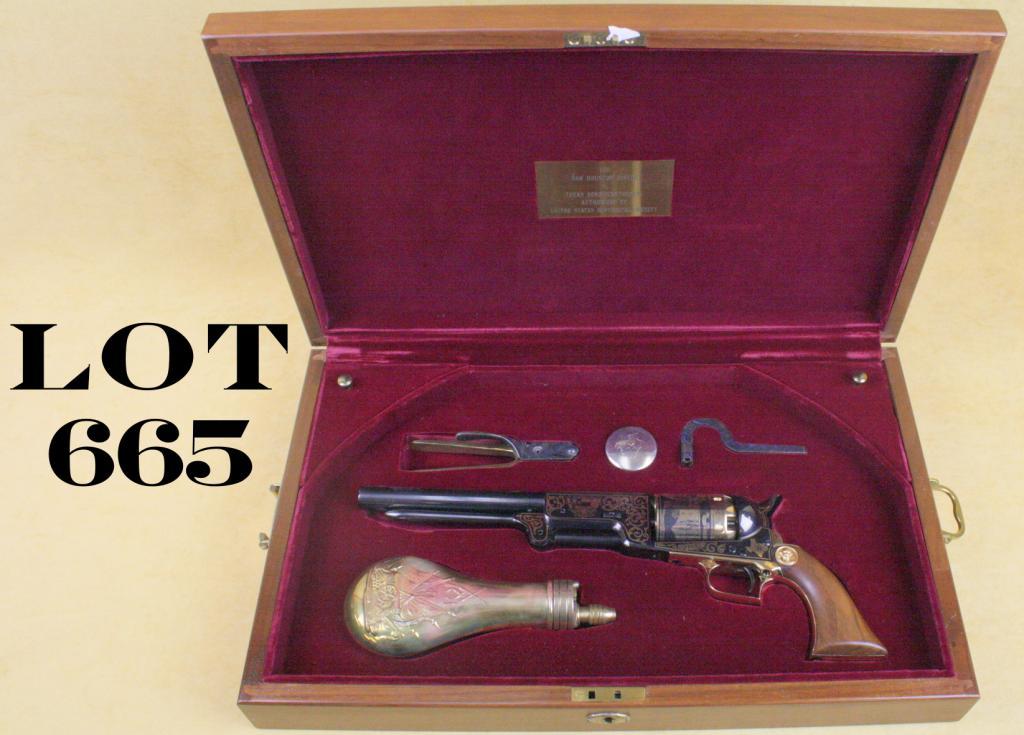 Presentation wood cased with accessories Italian-made copy of a Colt Walker Model percussion revolver authorized by the United States Historical Society entitled “The Sam Houston Pistol” commemorating the TexasSesquicentennial, .44 cal., 9” barrel, blue finish with gold ornamentation on the frame, cylinder and barrel assembly, brass trigger guard and back strap, wood grips with inset of Sam Houston on the top of the left grip,#1220. This gun is in like new condition and is nicely ornamented with images of the Alamo, Texas and Confederate flags, Indian tomahawk, map of Texas, etc. The box is maroon lined with reproduction brass powderflask, bullet mould cap tin and combination wrench; the outside of the wood box is decorated with an inset panel showing Sam Houston’s likeness, flags and stand of Texas flags. The case itself is in overallexcellent condition. Est.: $700-$1,400.