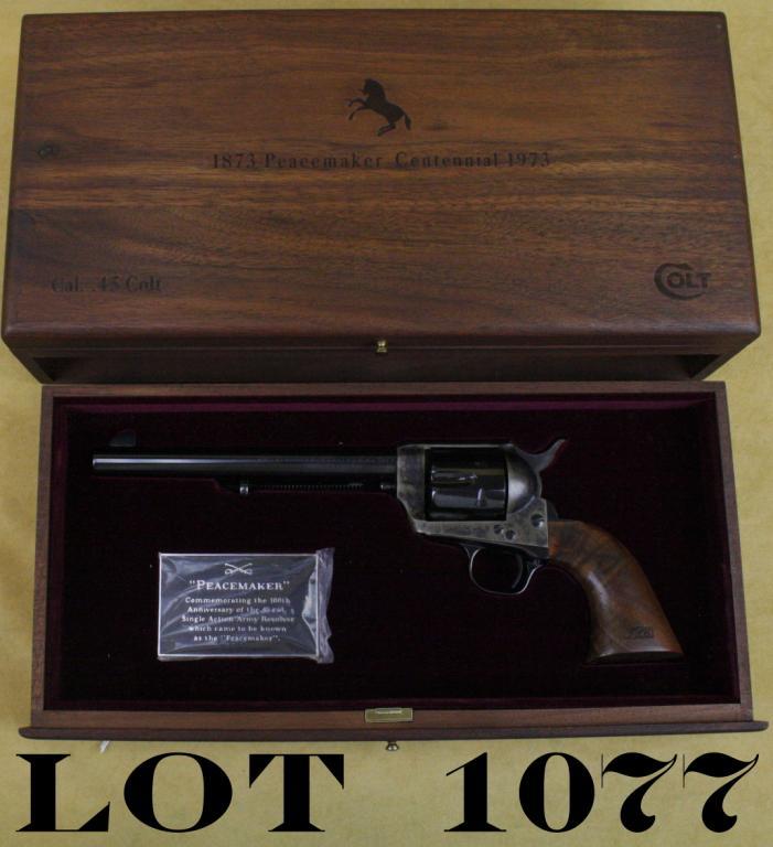 Presentation wood drawer style casing of a Colt Centennial Peacemaker SAA revolver, .45 cal., 7-1/2” barrel, blue and case hardened finish, smooth wood grips with inspector cartouche, #PC1116. This gun is in overalllike new condition showing little handling, beautiful original blue and case colors, nicely grained wood grips; accompanied by a Colt wood display case with glass cover under the wood lid and a drawer that comes forward showing a fitted maroon velveteen interior with metal display plaque inside the case noting this “Peacemaker” 100th Anniversary Single Action Army revolver. Buyer of this lot has option to buy the next lot for thesame price given the related serial numbers. Est.: $1,800-$2,800.