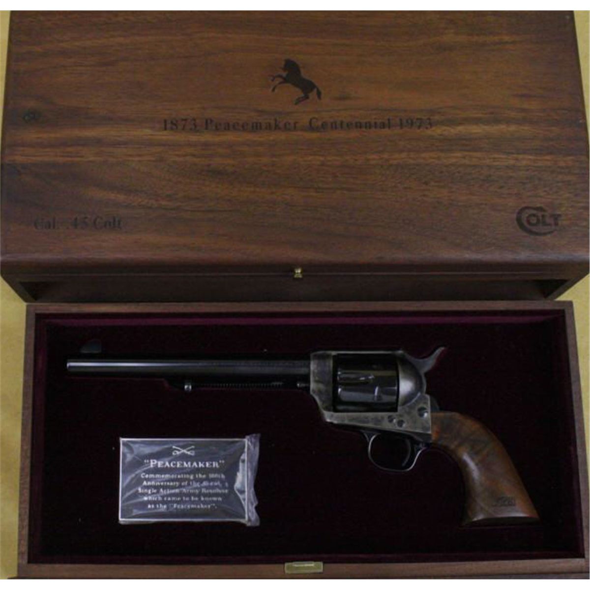 Presentation wood drawer style casing of a Colt Centennial Peacemaker SAA revolver, .45 cal., 7-1/2” barrel, blue and case hardened finish, smooth wood grips with inspector cartouche, #PC1116. This gun is in overalllike new condition showing little handling, beautiful original blue and case colors, nicely grained wood grips; accompanied by a Colt wood display case with glass cover under the wood lid and a drawer that comes forward showing a fitted maroon velveteen interior with metal display plaque inside the case noting this “Peacemaker” 100th Anniversary Single Action Army revolver. Buyer of this lot has option to buy the next lot for thesame price given the related serial numbers. Est.: $1,800-$2,800.