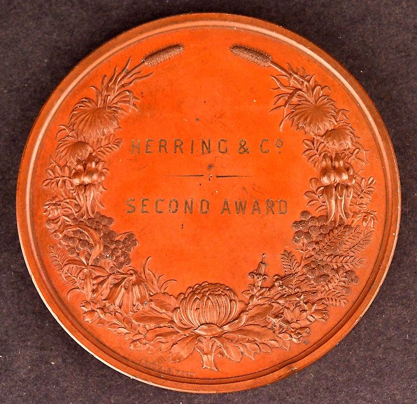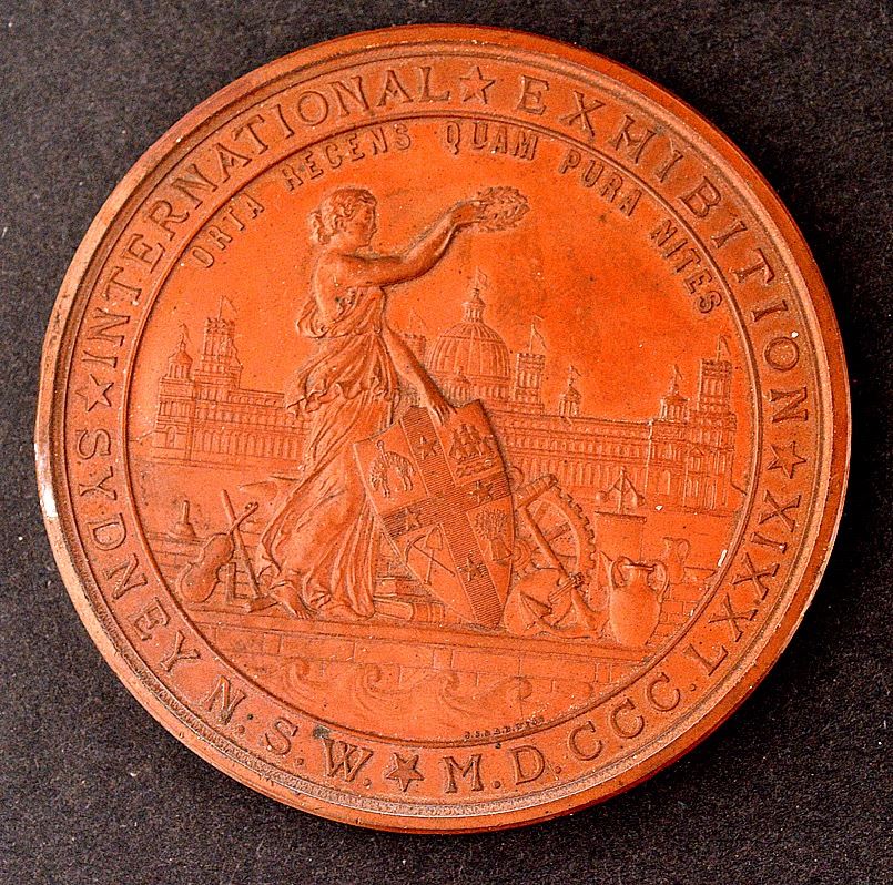 Obverse: *INTERNATIONAL* EXHIBITION * / SYDNEY N.S.W. * M.D.CCC LXXIX / ORTA RECENS QUAM PURA NITES, Brittania standing at centre, with wreath over Exhibition hall, at shoreline, with waves and symbols of industry; Reverse: "Herring & Co., Second Award", surrounded by wreath; Ae, 76mm, by J.S. & A.B.WYON. I believe the medal is attribuable to a Canadian firm, from Atlantic Canada, but initial research doesn't get me too far. Couple of edge knocks, otherwise Good VF. Nice high relief medal.