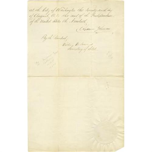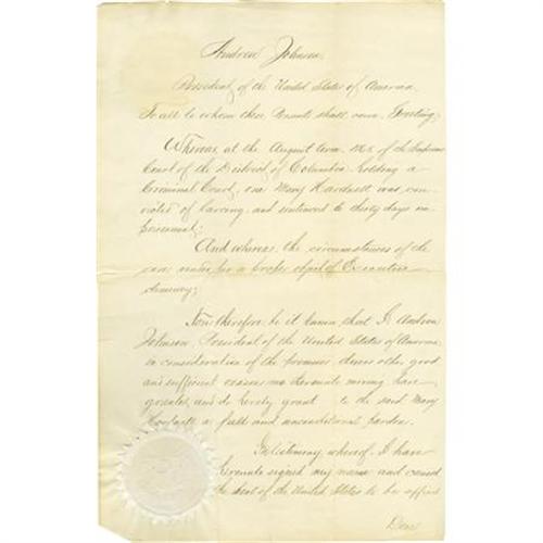 <B>President Andrew Johnson Document Signed,</B></I> two pages, 10.5” x 16.75”, Washington, D.C., august 26, 1865, countersigned by William H. Seward, Secretary of State. This manuscript grants a Presidential pardon to one Mary Hardnett, who was “<I>convicted of larceny, and sentenced to thirty days imprisonment.</B></I>” Affixed with Presidential Seal. Complete separation along central fold, else sound stock with only light browning. This item is certainly evocative of a bygone era in that one cannot imagine a modern chief executive bothering with such a small-time criminal case. <I>Ex. Henry C. Luhrs Collection. </B></I><BR><BR><b>Shipping:</b> Flat Material, Small (<a target="_blank" href="http://www.heritageauctions.com/common/shipping.php">view shipping information</a>)