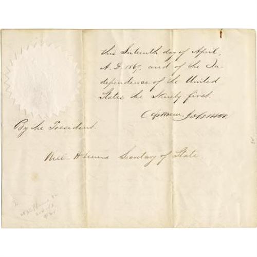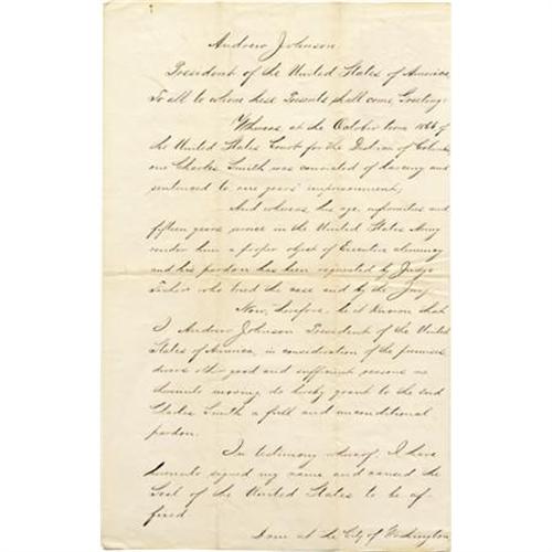 <B>President Andrew Johnson Document Signed, </B></I> one page with docketing, 10” x 16.5”, Washington, D.C., April 16, 1867, countersigned by Secretary of State William H. Seward<B>.</B></I> This manuscript is a pardon for Charles Smith, a convicted thief. Bold signatures, evenly toned paper. With split along one fold, else fine condition. <I>From the collection of Henry E. Luhrs.</B></I><BR><BR><b>Shipping:</b> Flat Material, Small (<a target="_blank" href="http://www.heritageauctions.com/common/shipping.php">view shipping information</a>)