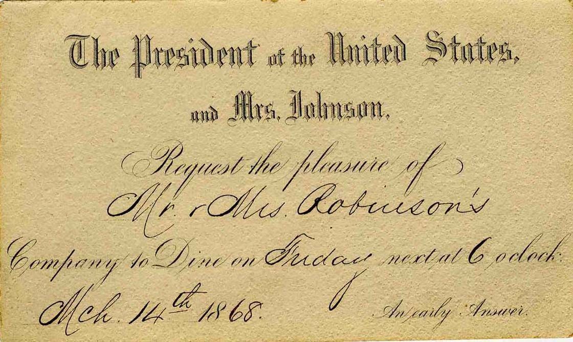 Rare invitation from President and First Lady Johnson, requesting ''the pleasure of Mr. & Mrs. Robinson's Company to Dine on Friday next at 6 o'clock Mch. 14th 1868''. Elegantly printed invitation measures 6'' x 5'', with a large embossed ''J'' on the upper blank portion. The likely invitee, William E. Robinson, was a Democratic representative from New York who in the 1840's wrote for the New York Tribune under the name ''Richelieu.'' Minor wear and mounting remnants on verso, else near fine.