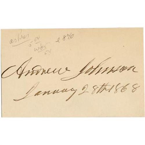 <B>President Andrew Johnson Signed Card</B></I> 3.5” x 2”, January 28th, 1868. Near fine. <I>From the collection of Henry E. Luhrs.</B></I><BR><BR><BR><b>Shipping:</b> Flat Material, Small (<a target="_blank" href="http://www.heritageauctions.com/common/shipping.php">view shipping information</a>)