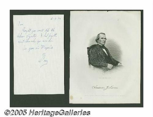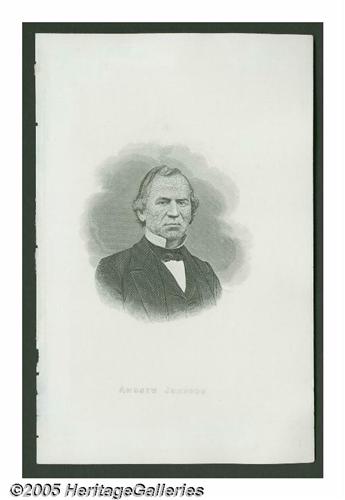 <B>President Andrew Johnson Vignette</B></I> A large vignette of President Johnson bearing a facsimile signature. Included is a brief handwritten note to Tom O'Mara from Doug Hales, "Thought you would like this Johnson vignette. I had forgotten about it when you were here." On the visit referred to, Tom had acquired Andrew Johnson's presentation book from Doug Hales.