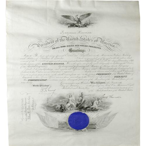 <B>President Benjamin Harrison Signed Naval Appointment 1893.</B></I> Partly printed document signed "<I>Benj. Harrison</B></I>" as president, 15.5" x 19.5", on vellum, Washington, January 14, 1893. A beautifully engraved naval commission issued to Walter S. Burke as "assistant engineer with the relative rank of ensign." Countersigned by Secretary of the Navy B. F. Tracy. Top and bottom ornately engraved with nautical scenes. Two minor chips at the edges and two tiny holes at a fold, otherwise very bright with crisp engravings.<BR><BR><b>Shipping:</b> Flat Material, Large (<a target="_blank" href="http://www.heritageauctions.com/common/shipping.php">view shipping information</a>)