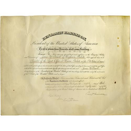 <B>President Benjamin Harrison signed document</B></I> Dated April 8, 1889, this certifies the appointment of James McDowell as Land Office Registrar. It was signed clearly by president Harrison in his usual manner as "Benj. Harrison". The paper itself measures approximately 18x24 and exhibits some chipping and spotting and displays a small tear of approximately 1" in length at the top of the document. Overall, it still retains fairly good exhibit quality.