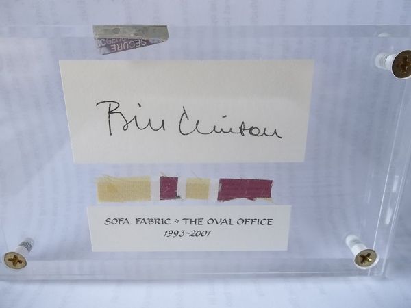 Lucite encased swatch of fabric from an oval office sofa re-upholstered after he left (I would have too) along with a hand signed card. There were 100 of these made and given to key staff members by President Bill Clinton when he left office.