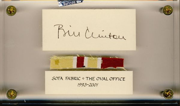 President William J. Clinton ink signed card and swatch taken from one of the couches in the Oval Office when the upholstery was changed. These were done in very limited amounts and were mounted in Lucite cubes when he left office and the couch was re-upholstered. These were presented to a few key staff members in his cabinet. This item comes with a certificate of authenticity guaranteed for the life of the piece.