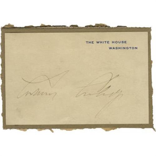 <B>President Calvin Coolidge Signed Card,</B></I> 4.25" x 2.75", on White House note card, mounted on art board. Coolidge (1872-1933) was the 30th President of the United States (1923-1929). A lawyer from Vermont, Coolidge worked his way up the ladder of Massachusetts state politics, eventually becoming governor of that state. He was elected as the 29th Vice President in 1920 and succeeded to the Presidency upon the death of Warren G. Harding. He was elected in his own right in 1924, and gained a reputation as a small-government conservative. Faded else very good. <BR><BR><b>Shipping:</b> Flat Material, Small (<a target="_blank" href="http://www.heritageauctions.com/common/shipping.php">view shipping information</a>)