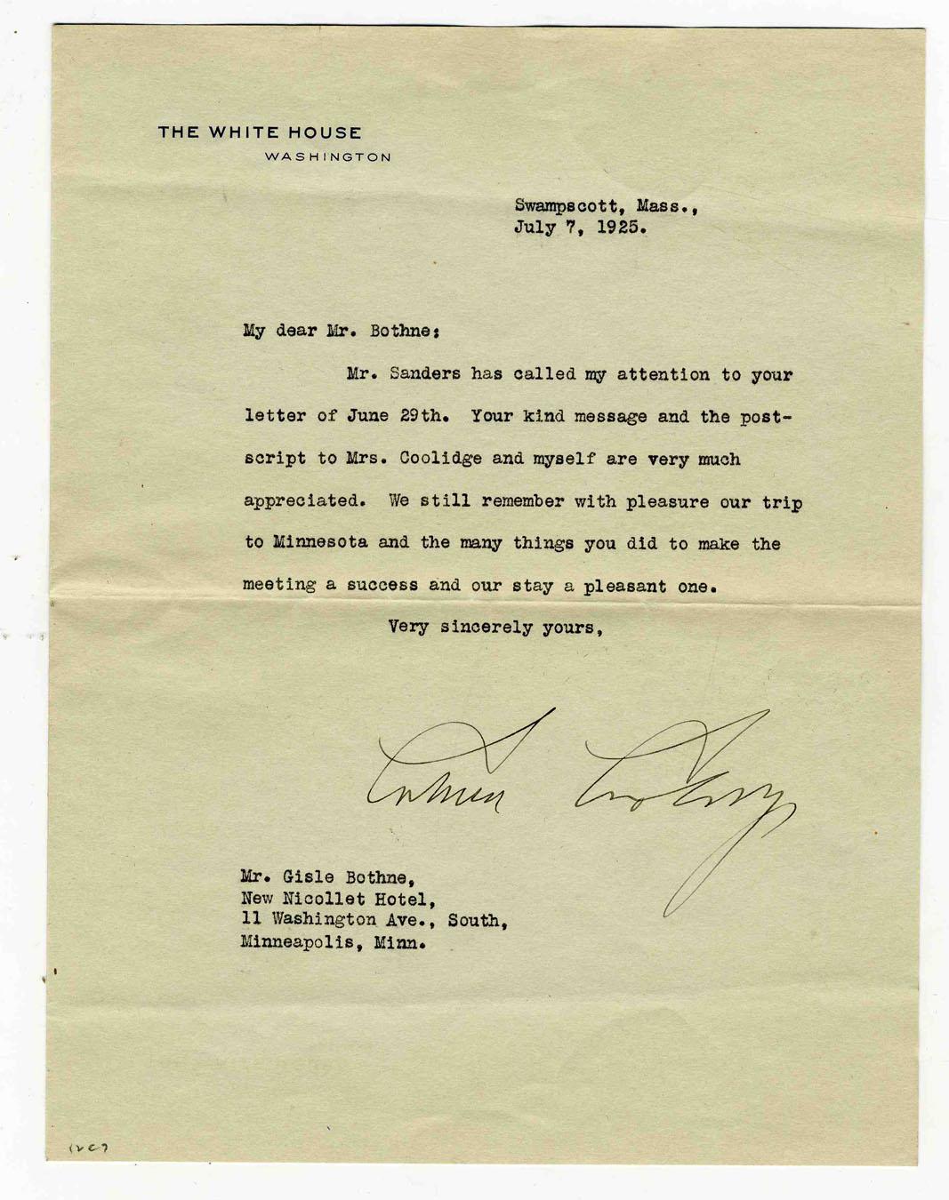 President Calvin Coolidge typed letter signed composed on White House stationery measuring 7” x 9.5”, and datelined Swampscott, MA, 7 July 1925 to Gisle Bothne, president of the Norse-American Centennial Celebration. In part: “...Your kind message...to Mrs. Collidge and myself are very much appreciated. We still remember with pleasure our trip to Minnesota...sincerely...Calvin Coolidge.” Accompanied by White House cover with stamp removed. Letter shows minor creasing and mailing folds, else fine.