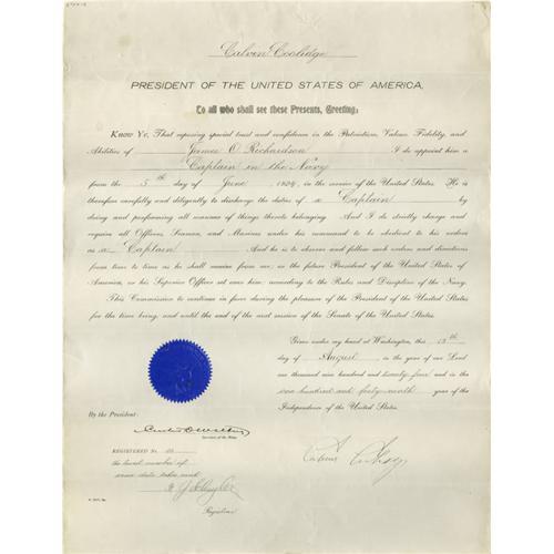 <B>President Calvin Coolidge signed document</B></I> Executed on August 13, 1924 and signed by Calvin Coolidge in a clear and clean signature is a military appointment for James Richardson as Captain in the Navy. This is in very good condition, measuring approximately 18x24 and showing minimal effects of age. A very attractive display item.