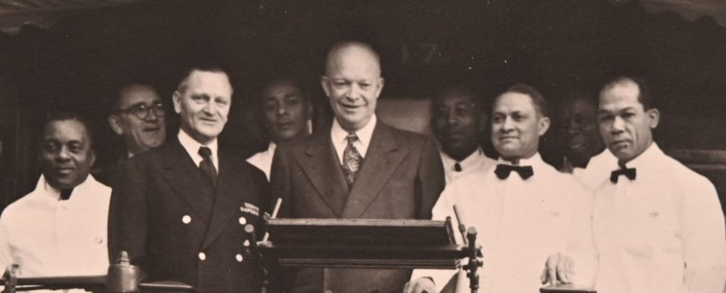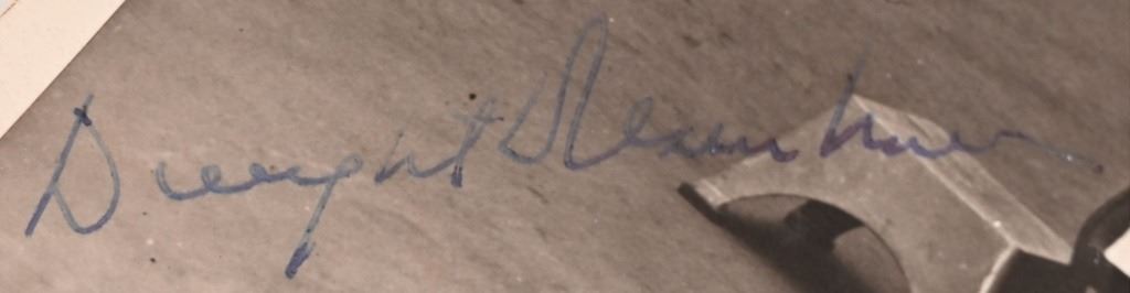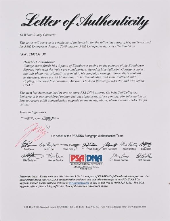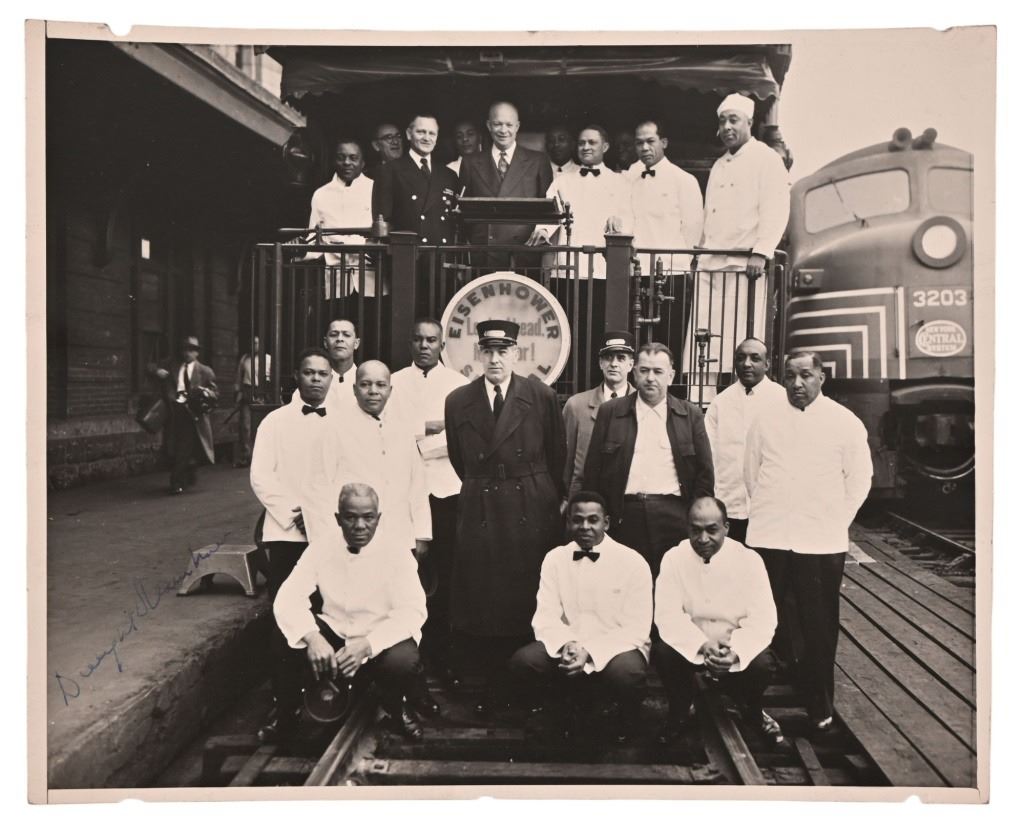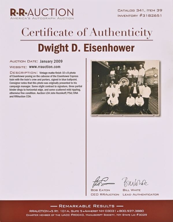 Vintage matte-finish 8 x 10 photo of Eisenhower posing on the caboose of the Eisenhower Express. Signed by Dwight D. Eisenhower, in blue ballpoint lower left. Provenance includes COA of signature examination.
