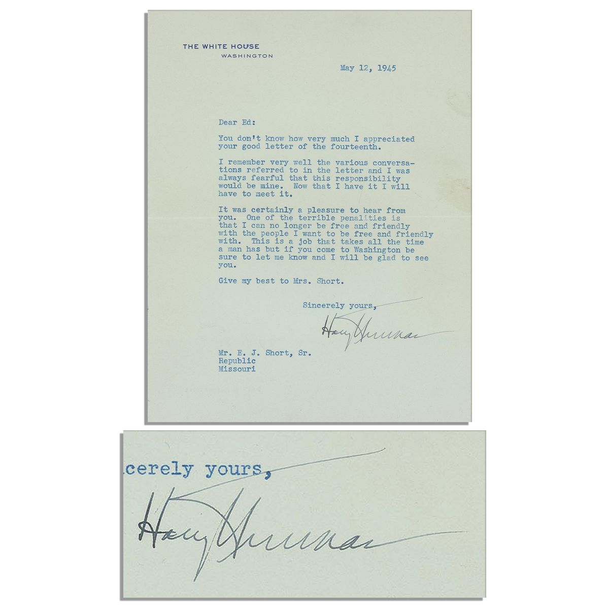 Harry Truman typed letter signed as President, dated 12 May 1945 on official White House stationery, exactly one month into his presidency. Addressed to friend, ''E.J. Short, Sr., Republic, Missouri'', excellent-content letter reads in full: ''Dear Ed: You don't know how very much I appreciated your good letter of the fourteenth. I remember very well the various conversations referred to in the letter and I was always fearful that this responsibility would be mine. Now that I have it I will have to meet it. It certainly was a pleasure to hear from you. One of the terrible penalties is that I can no longer be free and friendly with the people I want to be free and friendly with. This is a job that takes all the time a man has but if you come to Washington be sure to let me know and I will be glad to see you. Give my best to Mrs. Short''. Signed ''Harry S. Truman'' in black ink. Letter on one page measures 7'' x 8.75''. Horizontal fold and minor toning, else near fine. Includes original postmarked White House envelope.