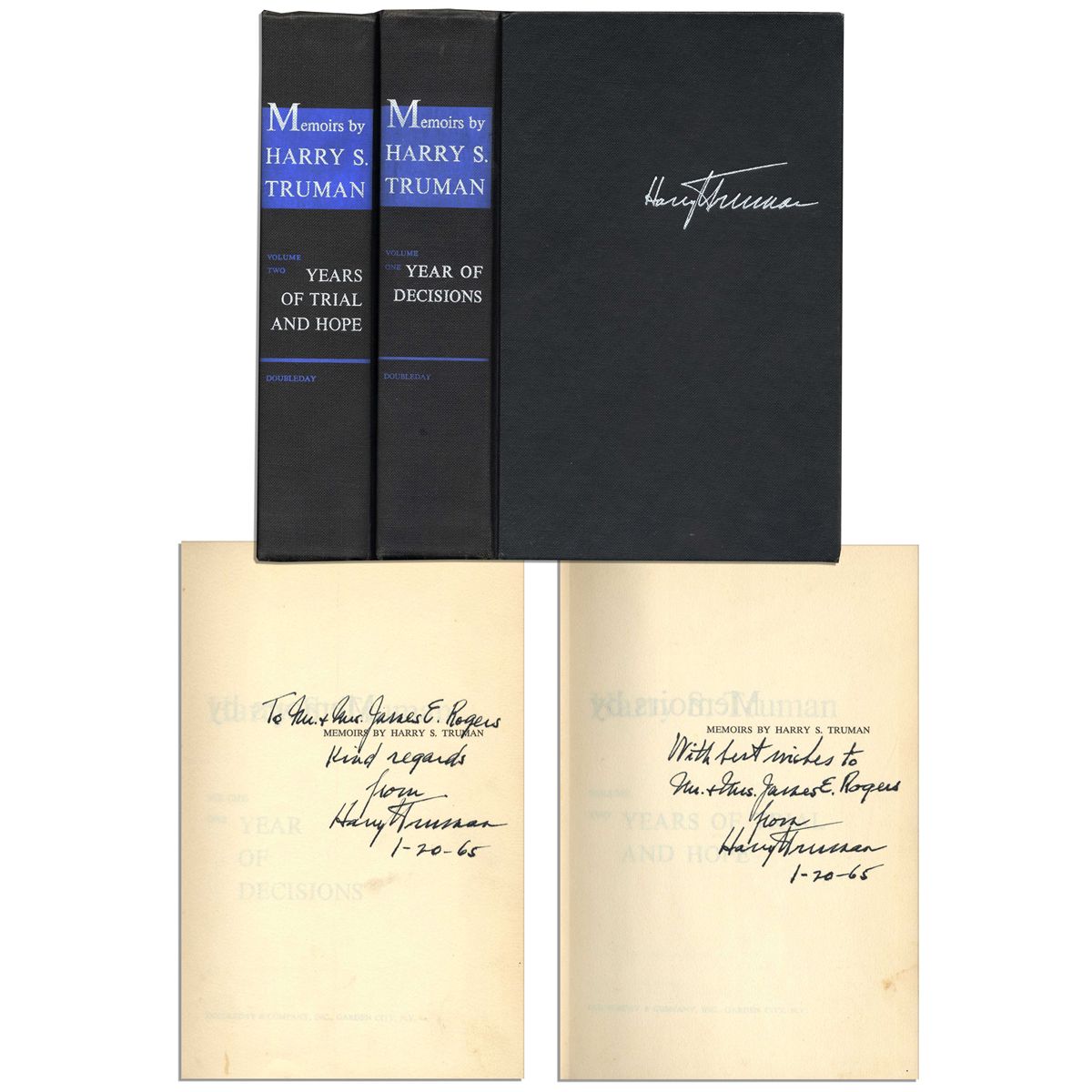 Harry Truman two-volume set of his memoirs, ''Years of Decisions'' and ''Years of Trial and Hope''. Doubleday: Garden City, NY: 1955 & 1956. Volume one is signed and inscribed on front fly-leaf, ''To Mr. & Mrs. James E. Rogers / Kind regards / From Harry S. Truman / 1-20-65''. Volume two is again signed and inscribed on front fly-leaf, ''With best wishes to Mr. & Mrs. James E. Rogers / from / Harry Truman / 1-20-65''. Volume one runs 596pp; volume two runs 594pp. Each measures 5.5 ''x 8.5'' with no dustjacket, bound in black boards with silver gilt lettering, and a blue segment to title of spine. Minor toning and foxing to cover of volume two. Near fine.