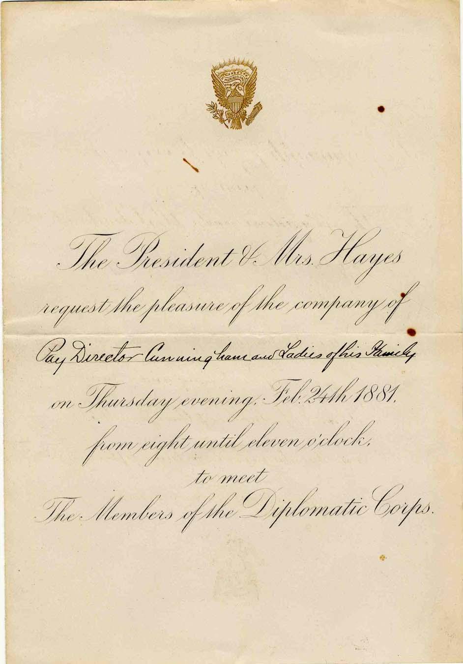Uncommon invitation by ''The President & Mrs. Hayes'' to meet ''The Members of the Diplomatic Corps'' on 24 February 1881. Invitation is extended to ''Pay Director Cunningham and Ladies of his Family.'' Single page measures 5.25'' x 7.75. Adorned with gilt Presidential eagle at top. Very good condition with isolated foxing, one horizontal fold and light wear.