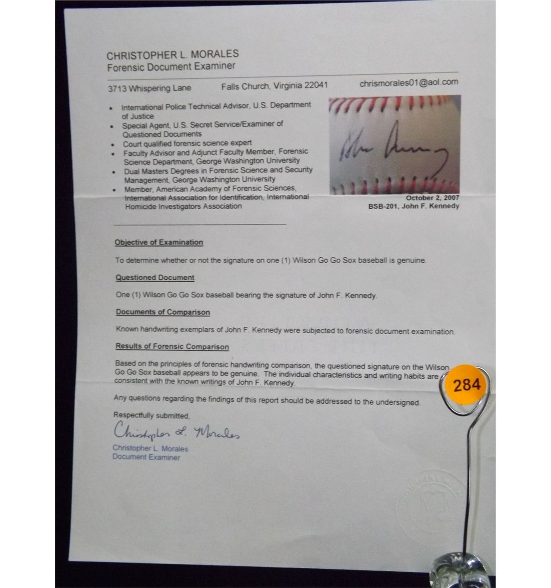 President John F Kennedy Autographed Baseball. Wilson "GO GO SOX" Official League Baseball. Appraised or estimated retail value $10000. COA by Christopher Morales. All Sales Final. Please see terms and conditions of auction.