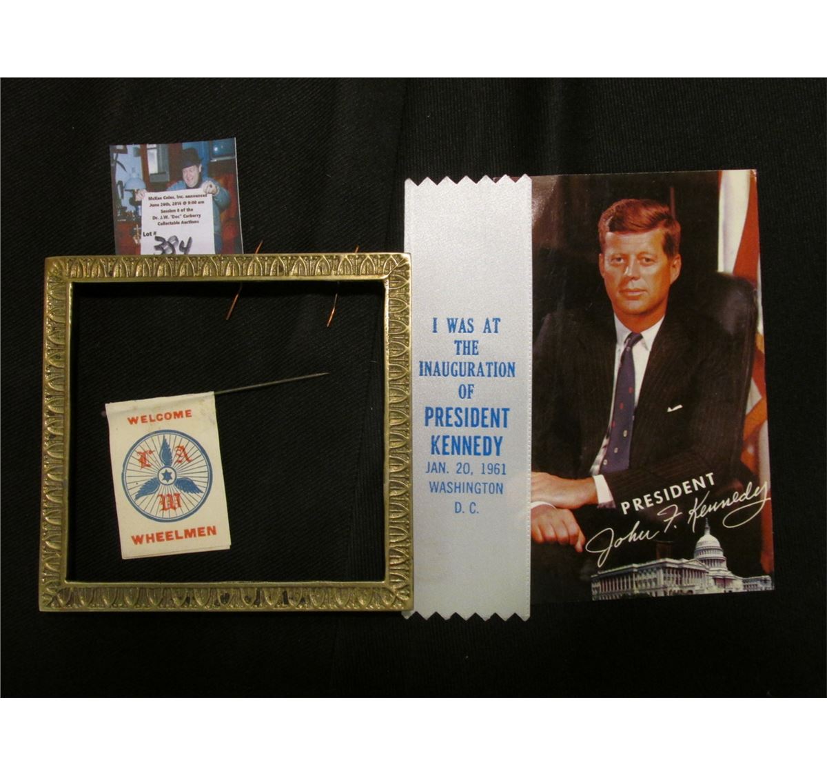 "President John F. Kennedy" Postcard; White Ribbon with blue lettering "I was at the Inauguration of President Kennedy Jan. 20, 1961 Washington D.C."; 4.25" x 4" Brass Picture Frame (no glass); & a ca. 1880 Stick Pin "Welcome Wheelmen".