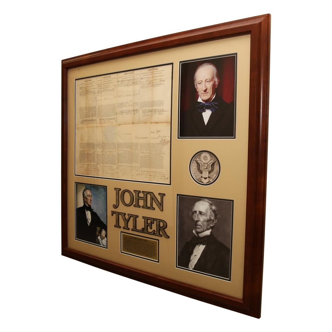 A President John Tyler autographed collage with document signed by President John Tyler. Measures 36" tall and 38" wide.